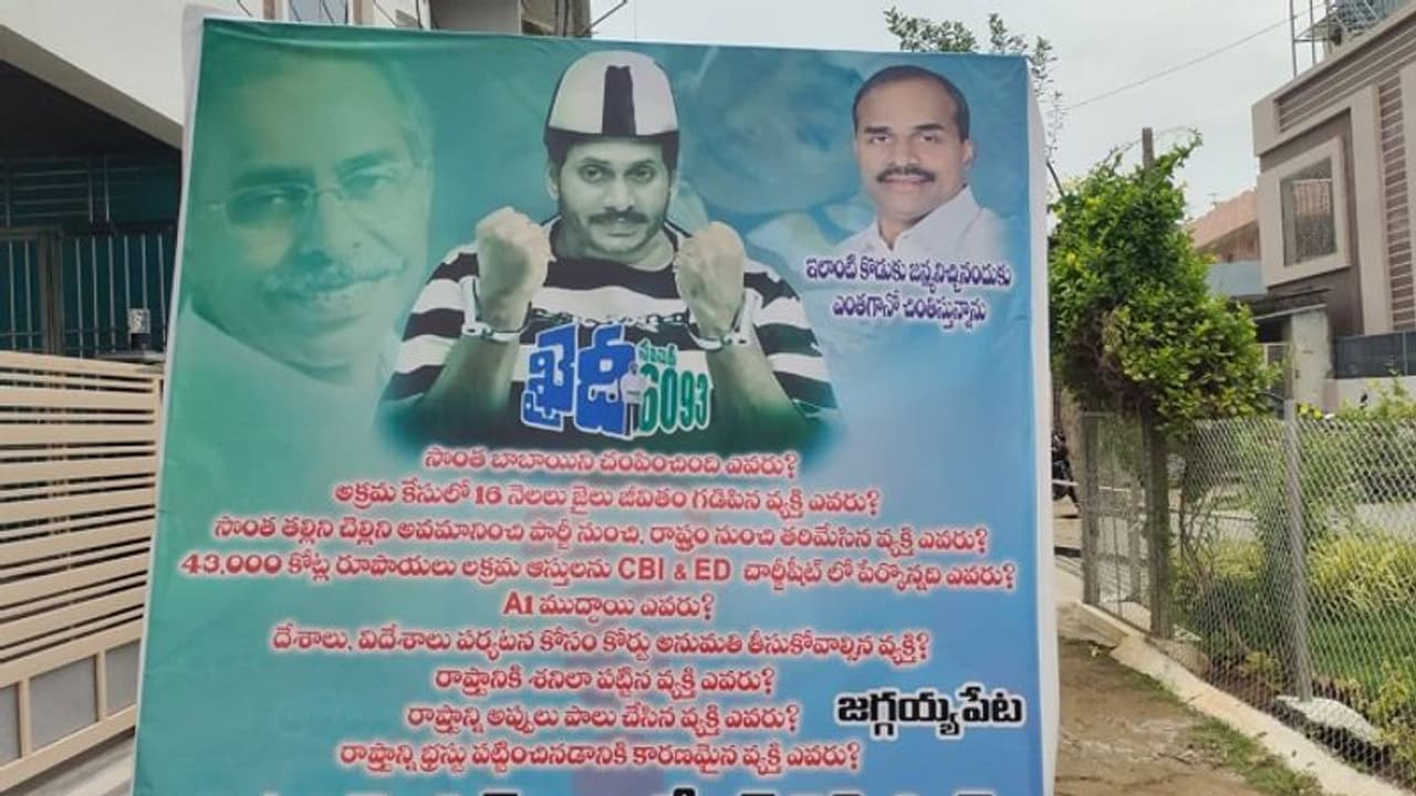 అంటూ ప్రశ్నలు సందిస్తూ.. జగ్గయ్యపేట వై.యస్. రాజశేఖర్ రెడ్డి ఫ్యాన్స్ పేరుతో పోస్టర్లు వెలిశాయి. ప్రస్తుతం ఈ పోస్టర్లు చర్చనీయాంశంగా మారాయి. ఇక ఈ పోస్టర్లో ఓ వైపు వైఎస్ ఫొటో.. మరోవైపు వైఎస్ వివేకా ఫొటోలు ఉన్నాయి. వైఎస్ఆర్ ఫొటో కింద.. ఇలాంటి కొడుకును కన్నందుకు చింతిస్తున్నానను అని రాసుకొచ్చారు. ఇక పోస్టర్ మధ్యలో.. ఖైదీ గెటప్ లో.. చేతులకు సంకెళ్లతో ఉన్న జగన్ ఫొటోను పెడుతూ ఖైదీ నెంబర్ 6093 అని ముద్రించారు.