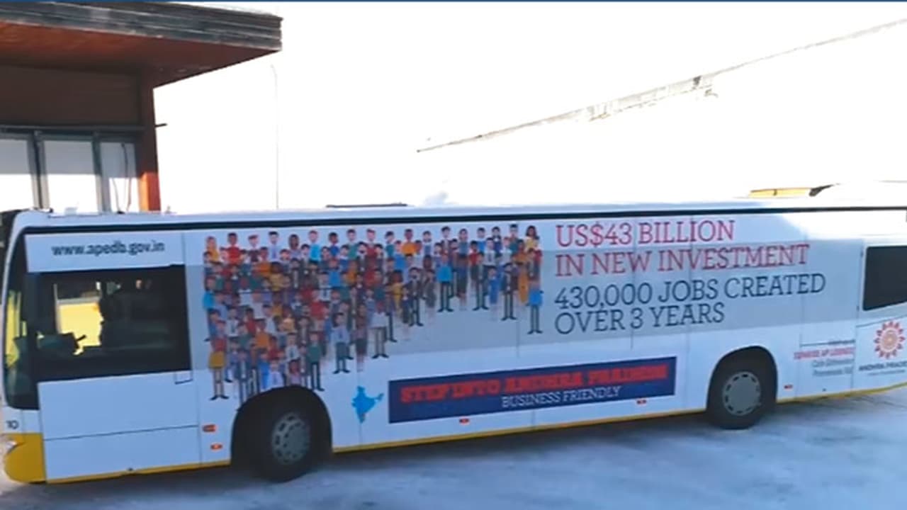 బస్సుకు మన దగ్గర అడ్వర్టైజ్ మెంట్ పోస్టర్లు అంటించినట్లే అక్కడా అంటించారు. కాకపోతే ప్రభుత్వానికి సంబంధించిన పోస్టర్లు అంటించారు. పెట్టుబడులకు ఫ్రెండ్లీ స్టేట్ అని, పెట్టుబడులకు స్వర్గధామమని బస్సుకు రెండు వైపులా పెద్ద పోస్టర్లు అంటించారంతే. బస్సు మీద పోస్టర్లు అంటించి దావోస్ లో తిప్పేస్తే పెట్టుబడులు వచ్చేస్తాయని ప్రభుత్వం ఎలా అనుకున్నదో ఏమో?