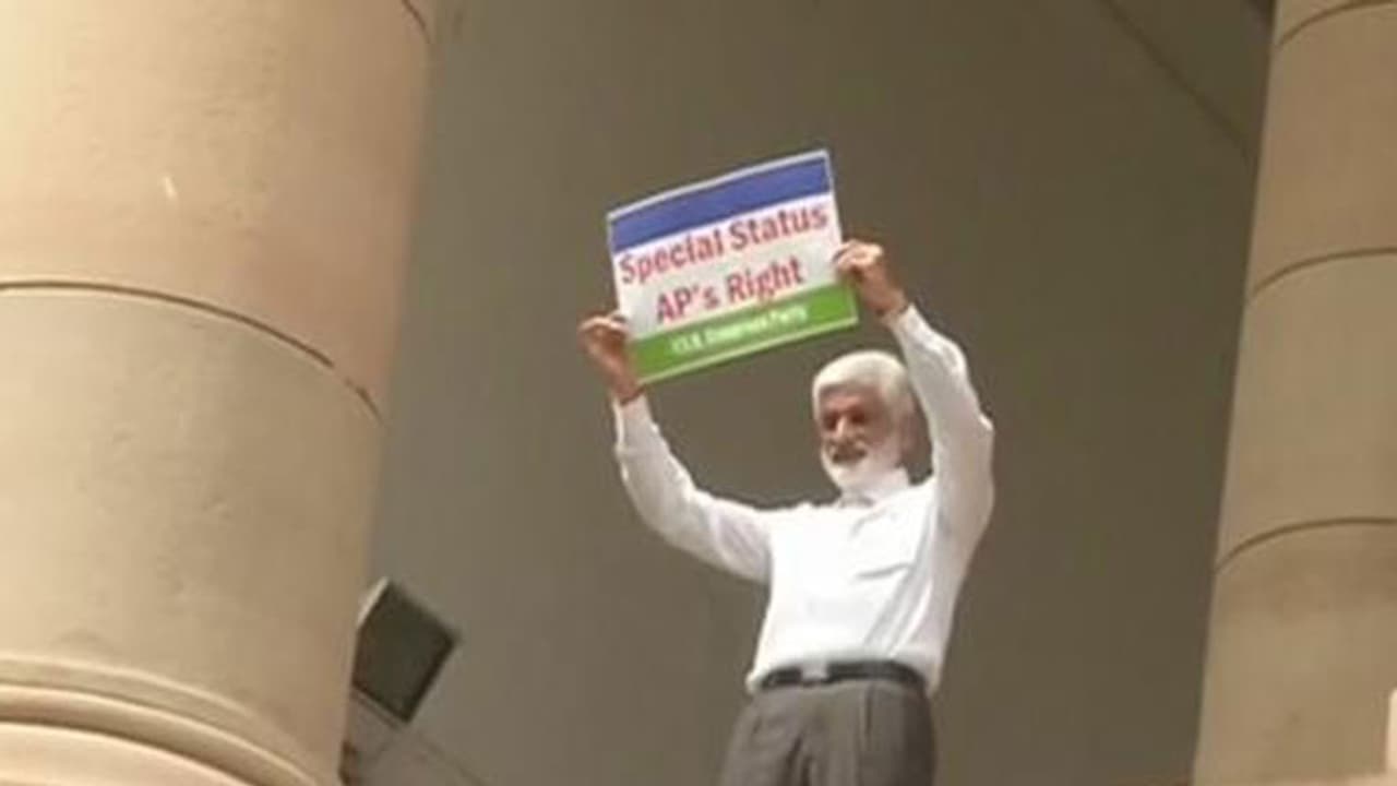 ఏపీకి ప్రత్యేక హోదా కల్పించాలంటూ విజయసాయిరెడ్డి గురువారం పార్లమెంట్ భవనంపైకి ఎక్కి నిరసన తెలిపారు. ప్రత్యేక హోదా ఆంధ్రుల హక్కు అంటూ ప్లకార్డులు ప్రదర్శించారు. హోదా సాధించే వరకు తమ పోరాటాన్ని కొనసాగిస్తామని ఆయన ఈ సందర్భంగా పేర్కొన్నారు. చంద్రబాబు ప్యాకేజీకి ఒప్పుకోవడం వల్లే రాష్ట్రానికి అన్యాయం జరిగిందన్నారు. ప్రత్యేక హోదా కోసం ప్రవేశపెడుతున్న అవిశ్వాస తీర్మానానికి టీడీపీ మద్దతు ఇవ్వాలని విజయసాయి రెడ్డి కోరారు. భద్రతా సిబ్బంది ఎంపి వద్దకు చేరుకుని క్రిందకు తీసుకొచ్చారు.