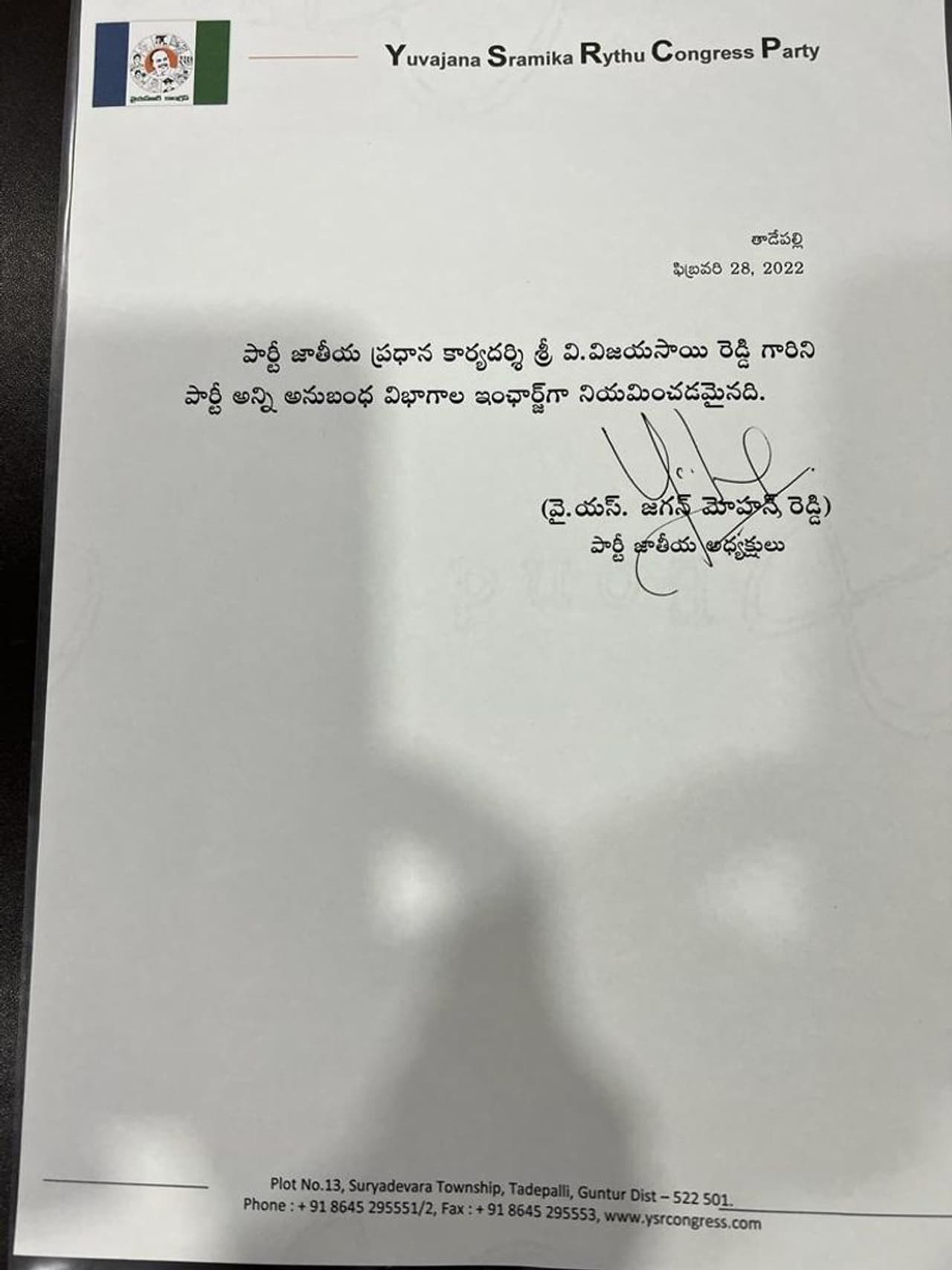 అమరావతి: ఆంధ్ర ప్రదేశ్ సీఎం, వైఎస్సార్ సిపి (ysrcp) అధినేత వైఎస్ జగన్మోహన్ రెడ్డి (ys jagan) కీలక నిర్ణయం తీసుకున్నారు. ఇప్పటికే పార్టీ జాతీయ ప్రధాన కార్యదర్శిగా కొనసాగుతున్న ఎంపీ విజయసాయి రెడ్డి (vijayasai reddy)కి మరిన్ని బాధ్యతలు అప్పగించారు. పార్టీ అన్ని అనుబంధ విభాగాల ఇంఛార్జ్ గా విజయసాయిని నియమించారు. ఇందుకు సంబంధించి వైఎస్సార్ సిపి జాతీయ అధ్యక్షులు వైఎస్ జగన్ పేరిట ఓ ప్రకటన వెలువడింది.