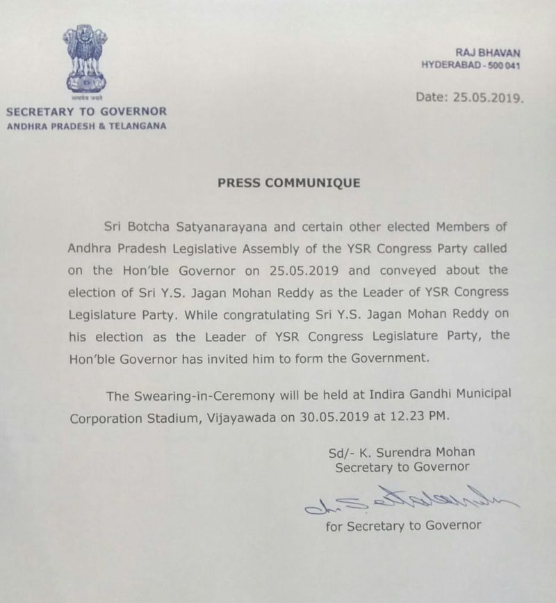 అనంతరం వైయస్ జగన్, ఆయన సతీమణి వైయస్ భారతిలు జగన్ ప్రమాణ స్వీకారానికి రావాల్సిందిగా ఆహ్వానించారు. ఈనెల 30న విజయవాడలోని ఇందిరాగాంధీ మున్సిపాలిటీ స్టేడియంలో మధ్యాహ్నాం 12.23 నిమిషాలకు వైయస్ జగన్మోహన్ రెడ్డి ముఖ్యమంత్రిగా ప్రమాణ స్వీకారం చేయబోతున్నారు.