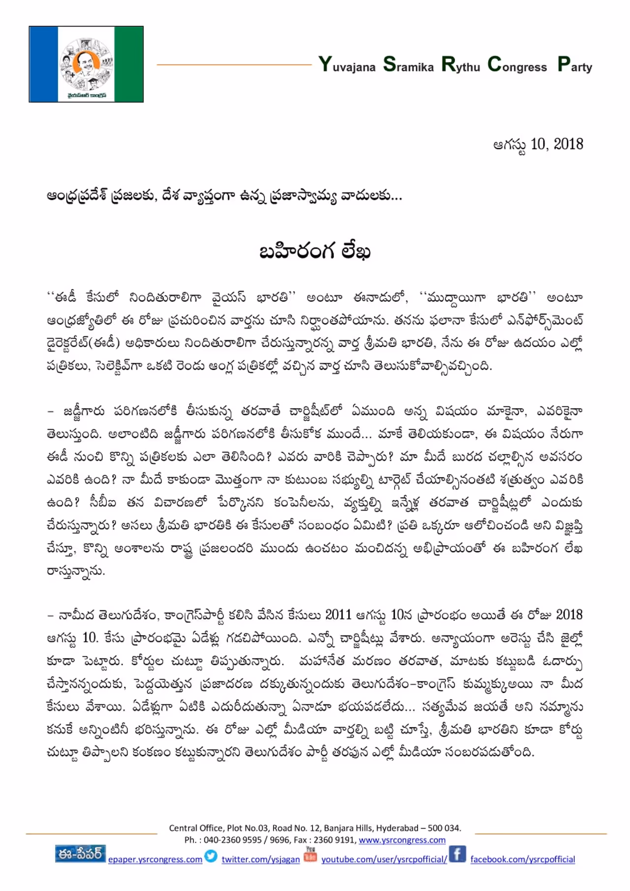 అమరావతి: వైఎస్ భారతికి ఈడీ కేసులతో ఎలాంటి సంబంధం ఉందని వైసీపీ చీప్ జగన్ ప్రశ్నించారు. జగన్ సతీమణి భారతికి ఈడీ సమన్లు అంటూ వచ్చిన వార్తలపై జగన్ మండిపడ్డారు. ఈ విషయమై ఏపీ ప్రజలకు జగన్ బహిరంగ లేఖ రాశారు.