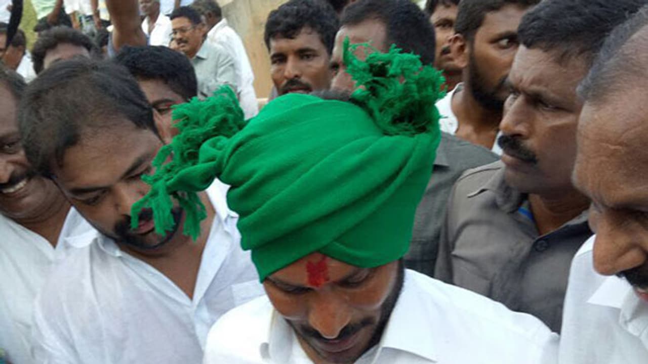 ప్రజా సంకల్పయాత్రలో భాగంగా వైసీపీ అధినేత వైఎస్ జగన్మోహన్ రెడ్డి గురువారం మధ్యాహ్నం రైతుల ఆందోళనలో పాల్గొన్నారు. పాదయాత్రలో 10వ రోజు కర్నూలు జిల్లాలోని ఆళ్ళగడ్డ నియోజకవర్గంలో పర్యటించారు. తన పర్యటనలో భాగంగా జగన్ కర్నూలు-దొర్నిపాడు మండలంలోని రైతులతో భేటీ అయ్యారు. తలపై పచ్చటి తలపాగా చుట్టుకుని జగన్ వైరెటీగా కనిపించారు. రైతుల సమస్యలపై వారితో మాట్లాడుతున్నారు కాబట్టి బహుశా సింబాలిక్ గా ఉంటుందని జగన్ పచ్చ రంగు తలలపాగా పెట్టుకున్నట్లున్నారు.