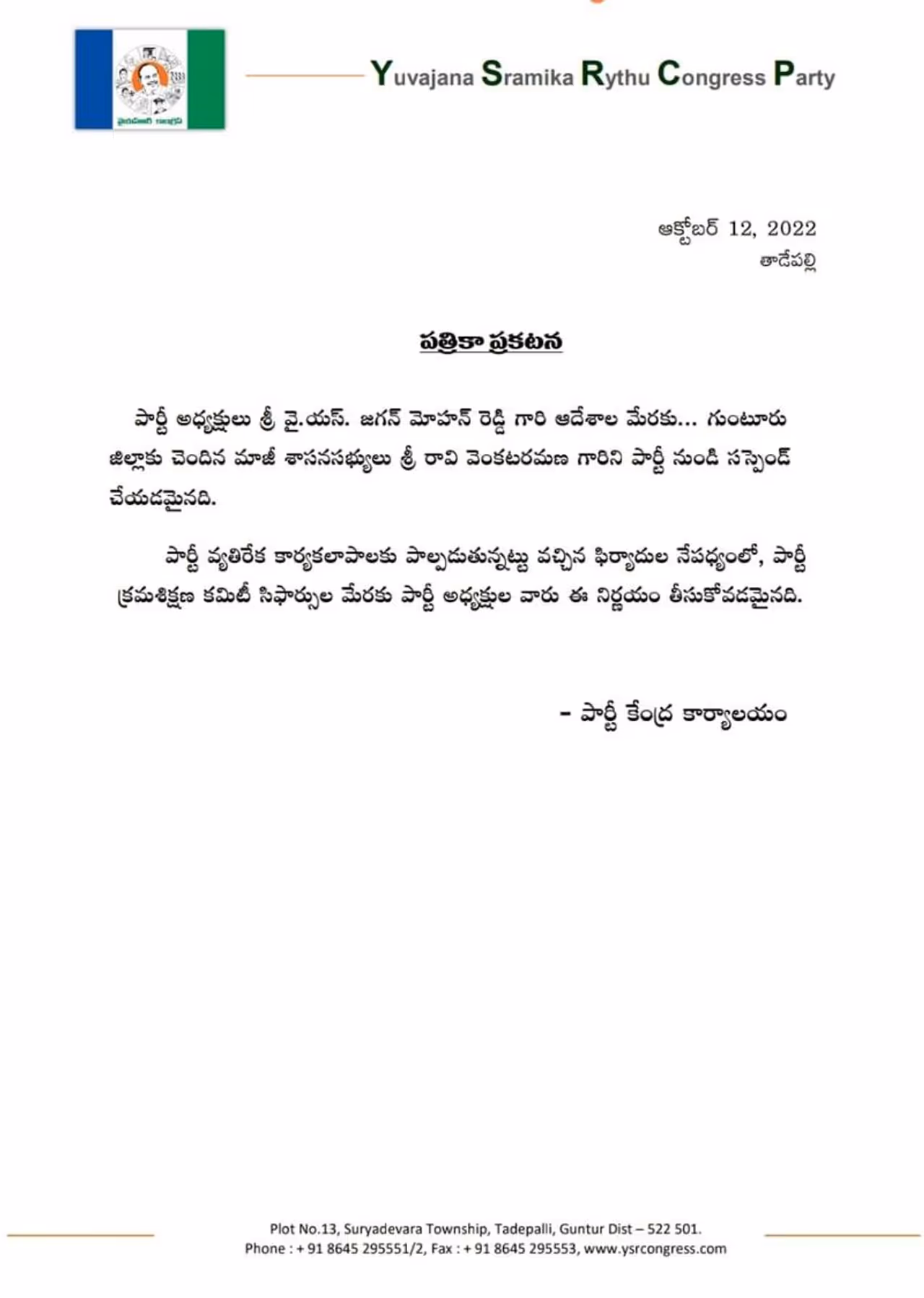 గుంటూరు జిల్లాకు చెందిన మాజీ ఎమ్మెల్యే రావి వెంకటరమణ వైసీపీ అధిష్టానం షాకిచ్చింది. ఆయనను పార్టీ నుంచి సస్పెండ్ చేసింది.