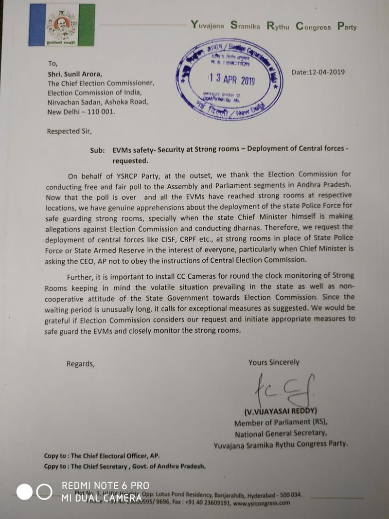 రాష్ట్ర పోలీసులపై తమకు నమ్మకం లేదని విజయసాయిరెడ్డి లేఖలో పేర్కొన్నారు. ప్రజల తీర్పును పటిష్టంగా భద్రపరచాల్సిన బాధ్యత కేంద్ర ఎన్నికల సంఘంపై ఉందని విజయసాయిరెడ్డి స్పష్టం చేశారు.