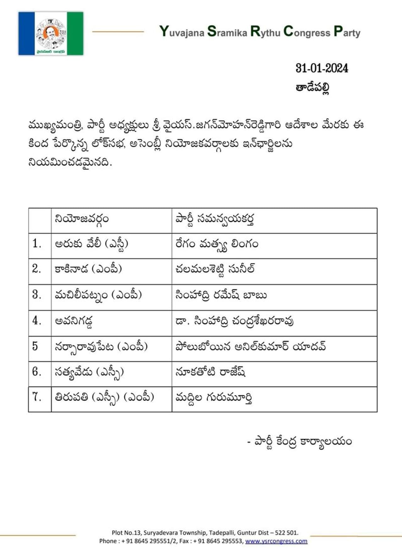మచిలీపట్నం ఎంపీ వల్లభనేని బాలశౌరి జనసేనలో చేరడంతో అవనిగడ్డ ఎమ్మెల్యే సింహాద్రి రమేష్ బాబును ఈ స్థానంలో ఇన్ఛార్జ్గా నియమించారు జగన్. అలాగే నరసరావుపేట ఎంపీ లావు కృష్ణదేవరాయలు పార్టీకి రాజీనామా చేయడంతో నెల్లూరు సిటీ ఎమ్మెల్యే అనిల్ కుమార్ యాదవ్ను ఈ స్థానంలో బరిలోకి దింపింది. తిరుపతి ఎంపీగా గురుమూర్తికి మరోసారి అవకాశం కల్పించారు వైసీపీ అధినేత. అవనిగడ్డ ఎమ్మెల్యే సింహాద్రి రమేష్ ను ఈసారి ఎంపీగా పంపించడంతో ఆయన బంధువు సింహాద్రి చంద్రశేఖర్ రావును ఇన్ఛార్జ్గా నియమించారు జగన్.