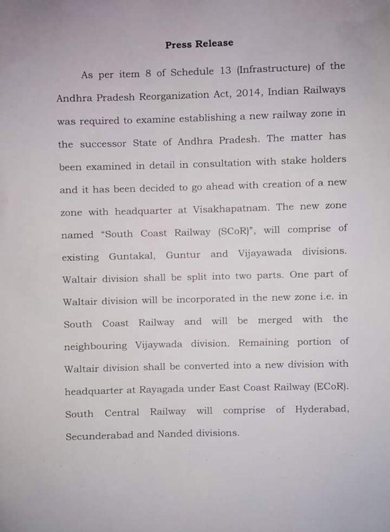 ఒక భాగం సౌత్ కోస్ట్ రైల్వో జోన్ లోని విజయవాడ డివిజన్ గా ఉంటుందని తెలిపారు. మిగిలిన భాగం రాయగఢ్ కేంద్రంగా కొత్త డివిజన్ గా ఉంటుందని తెలిపారు. సౌత్ సెంట్రల్ రైల్వే హైదరాబాద్, సికింద్రాబాద్, నాందేడ్ డివిజన్లుగా కొనసాగుతాయన్నారు.