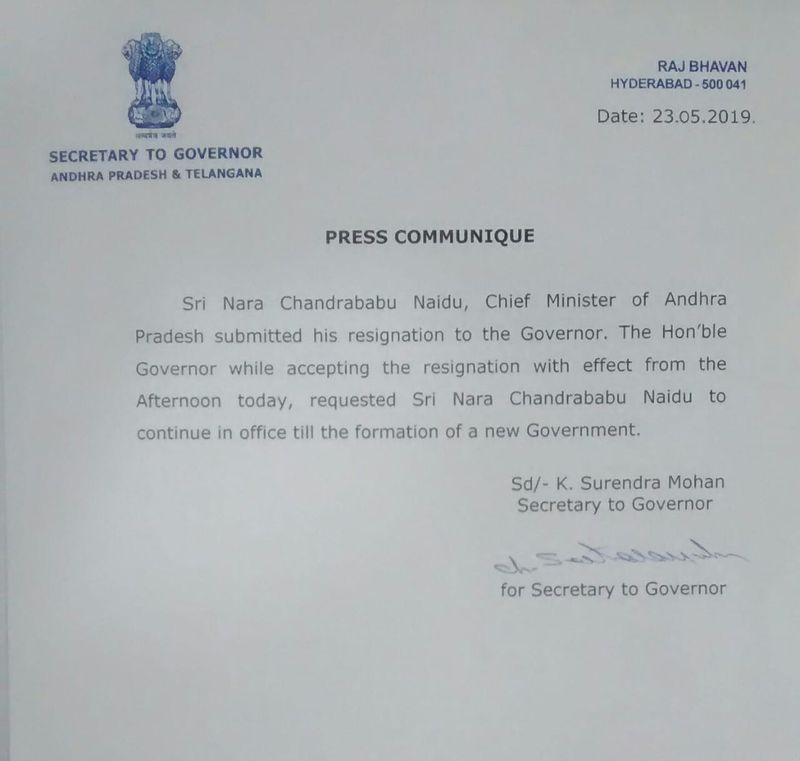 ఆంధ్రప్రదేశ్ రాష్ట్రానికి ముఖ్యమంత్రిగా చంద్రబాబు చేసిన సేవలను గవర్నర్ నరసింహన్ కొనియాడారు. ఐదేళ్లపాటు పరిపాలన అందించినందుకు గవర్నర్ నరసింహన్ ధన్యవాదాలు తెలిపారు. అనంతరం చంద్రబాబు రాజీనామాను ఆమోదిస్తున్నట్లు గవర్నర్ నరసింహన్ స్పష్టం చేశారు.
