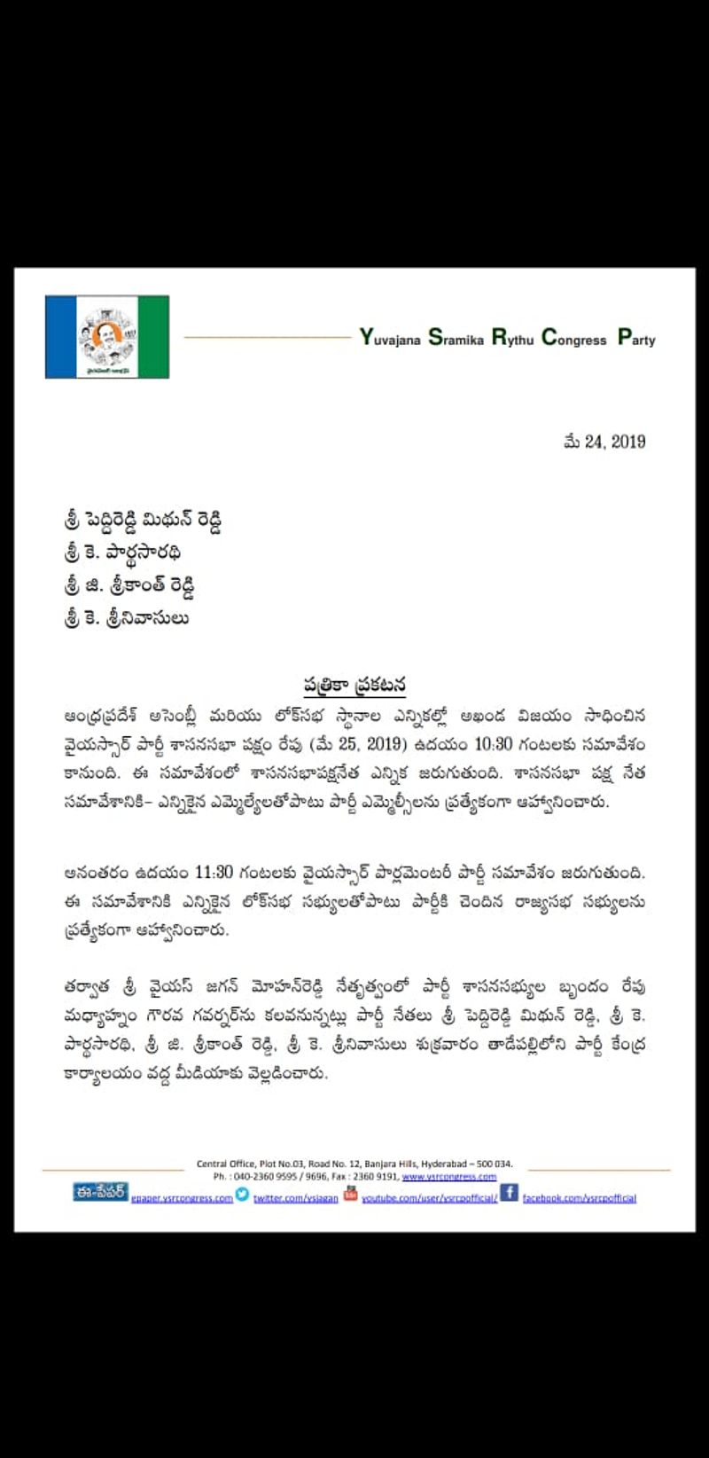 శాసన సభాపక్ష సమావేశం ఉన్నందు వల్ల నూతనంగా ఎన్నికైన ఎమ్మెల్యేలంతా తాడేపల్లిలోని పార్టీ కార్యాలయానికి రావాలని ఆహ్వానించారు. శాసనసభాపక్ష సమావేశంలో శాసనసభాపక్ష నేత ఎన్నిక జరగనుందని తెలిపారు.