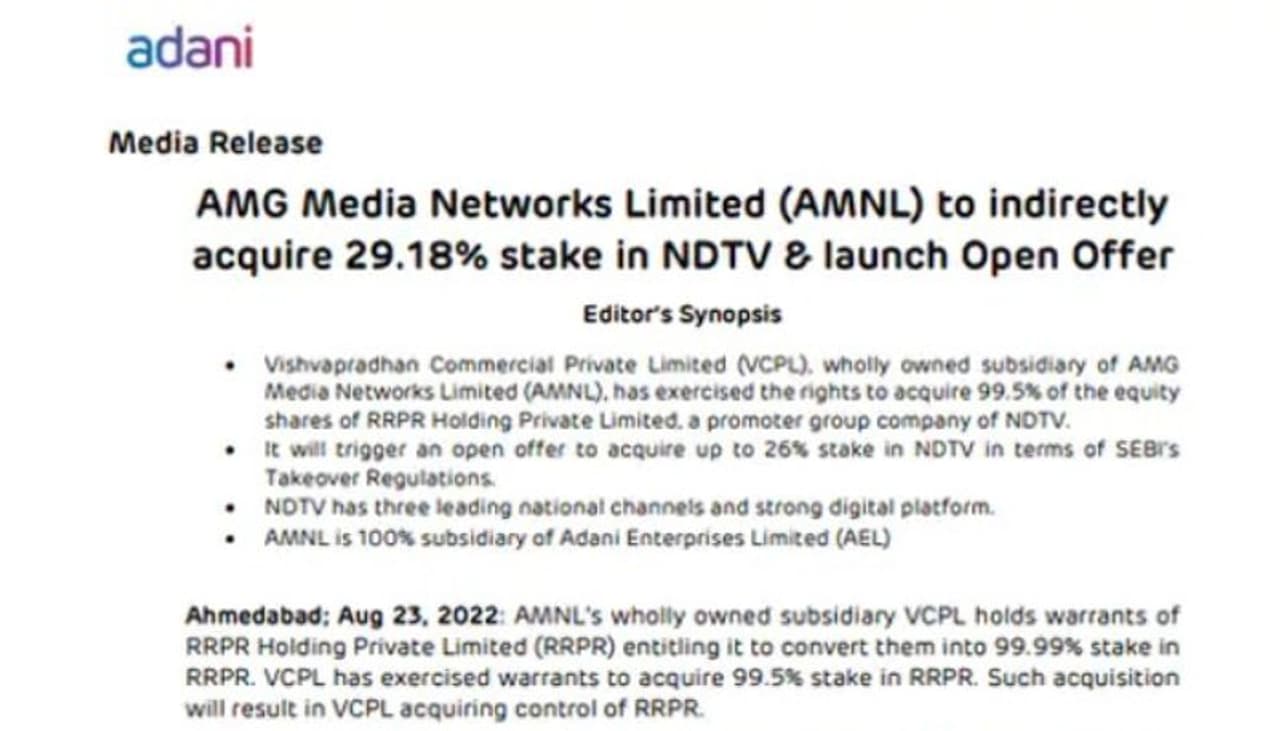 గౌతమ్ అదానీ గ్రూప్ కంపెనీ AMG మీడియా నెట్వర్క్ లిమిటెడ్, దేశంలోనే టాప్ మీడియా హౌస్ NDTVలో వాటాను కొనుగోలు చేయనున్నట్లు ప్రకటించింది. NDTV (న్యూ ఢిల్లీ టెలివిజన్ లిమిటెడ్)లో అదానీ గ్రూప్ 29.18% వాటాను కొనుగోలు చేస్తున్నట్లు ప్రకటించింది. అదే సమయంలో, ఓపెన్ ఆఫర్ ద్వారా NDTVలో 26 శాతం వాటా కొనుగోలుకు ఆసక్తిని కనబరిచింది.