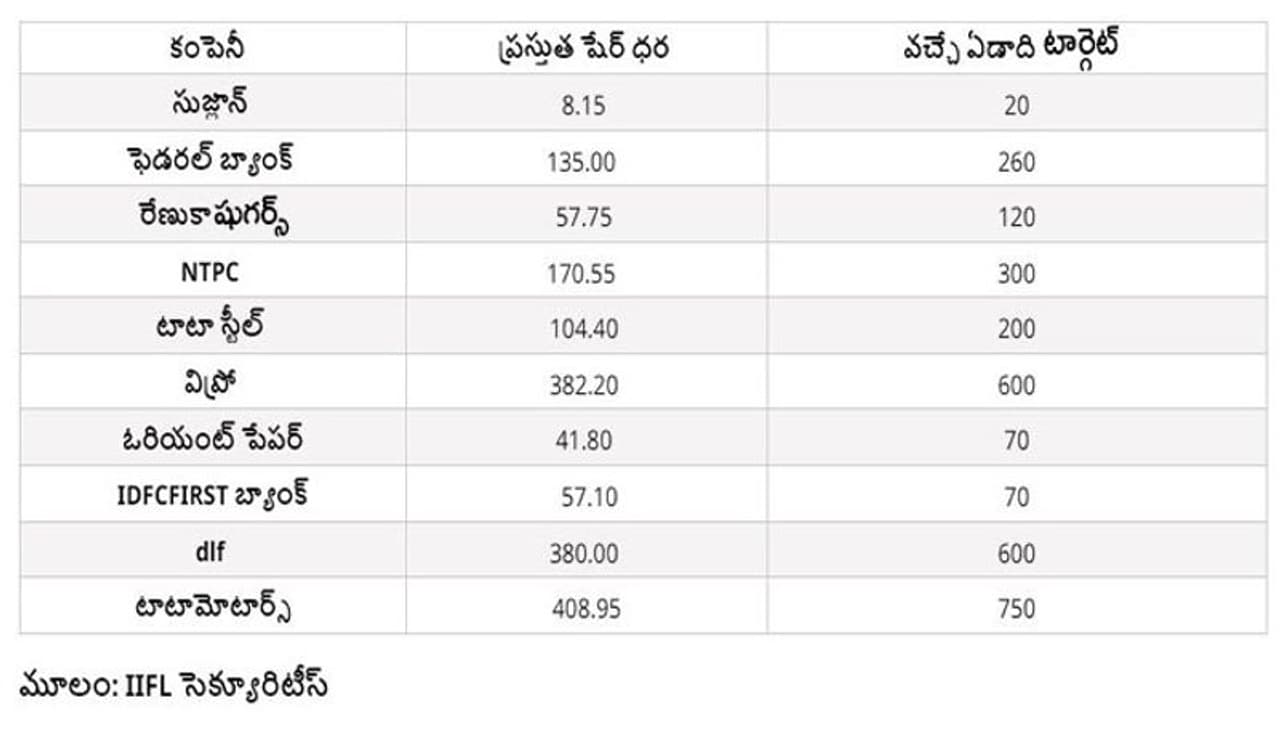బ్రోకరేజ్ హౌస్ IIFL సెక్యూరిటీస్ వచ్చే ఏడాదికి 10 స్టాక్లలో పెట్టుబడి పెట్టాలని సూచించింది. వచ్చే ఏడాదిలో ఈ షేర్లు ఇక్కడి నుంచి రెట్టింపు అవుతాయని బ్రోకరేజ్ హౌస్ నమ్ముతోంది. అంటే మీ డబ్బు రెట్టింపు అవుతుంది. అయితే, మీరు ఏదైనా స్టాక్లో పెట్టుబడి పెట్టడానికి ముందు మీ పరిశోధనను తప్పనిసరిగా చేయాలి. తొందరపడి ఏ స్టాక్లోనూ డబ్బు పెట్టుబడి పెట్టకండి.