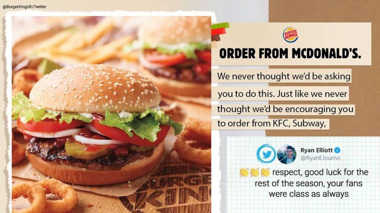 అమెరికన్ ఫాస్ట్ ఫుడ్ చైన్ బర్గర్ కింగ్ ఉద్యోగాలు కాపాడటానికి సోమవారం యు.కెలోని తన కస్టమర్లను మెక్డొనాల్డ్స్, కెఎఫ్సి, పాపా జాన్స్, టాకో బెల్స్ వంటి దాని పోటీదారుల నుండి ఫుడ్ ఆర్డర్ ఇవ్వమని విజ్ఞప్తి చేసింది. ఈ విషయాన్ని అధికారిక సోషల్ మీడియా ట్విటర్ ద్వారా షేర్ చేస్తూ పోస్ట్ చేసింది.