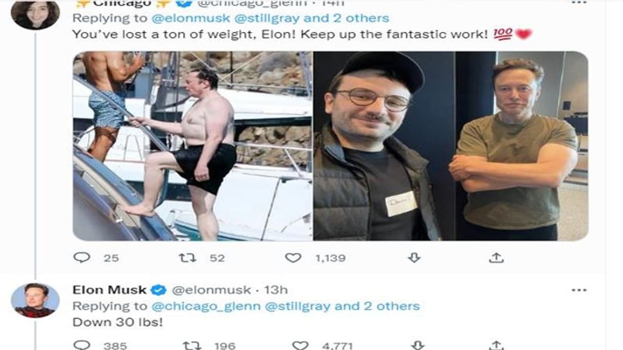 చికాగో అనే ట్విటర్ యూజర్ ఇలా వ్యాఖ్యానించారు, "మీరు చాలా బరువు తగ్గారు, ఎలాన్ మీ పనిని కొనసాగించండి! ” దానికి మస్క్, "30 పౌండ్లు కోల్పోయాను!" దీనికి కారణం ఏమిటని అడిగితే, “ఉపవాసం, రుచికరమైన ఆహారం లేకపోవడం వల్ల ఇది జరిగిందని మస్క్ బదులిచ్చాడు.