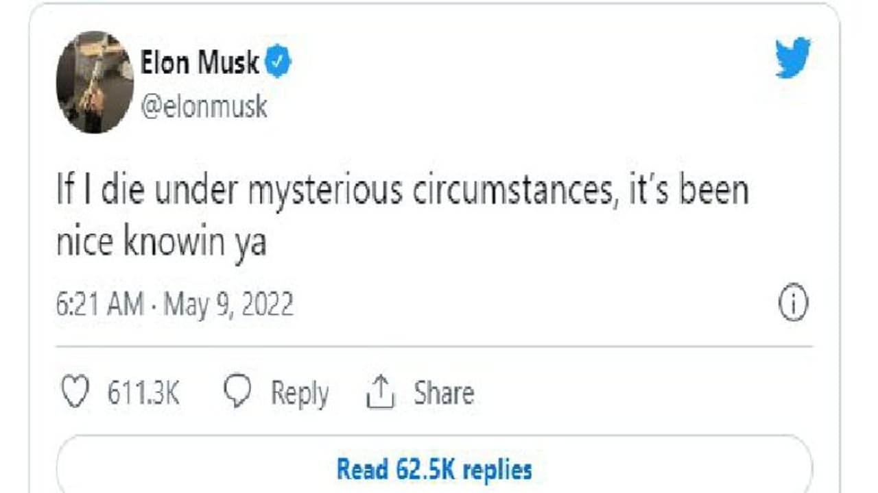 టెస్లా సీఈవో ఎలాన్ మస్క్ ట్విట్టర్లో హల్చల్ చేస్తున్నాడు. 44 బిలియన్లకు ట్విట్టర్ను కొనుగోలు చేయడానికి సిద్ధమైన మస్క్.. అప్పటి నుంచి ట్విట్టర్లో యాక్టివ్గా ఉంటున్నాడు. అదే స్థాయిలో విచిత్రమైన పోస్టులు చేస్తూ నెటిజన్లను ఆశ్చర్యపరుస్తున్నాడు. తాజాగా టెస్లా సీఈవో ఎలాన్ మస్క్ చేసిన ఓ ట్వీట్ సర్వత్రా చర్చనీయాంశంగా మారింది. ‘నేను అనుమానాస్పద స్థితిలో చనిపోతే.. మీ అందరితో పరిచయం అయినందుకు సంతోషం’ అంటూ ఎలాన్ మస్క్ ట్వీట్ చేశాడు.