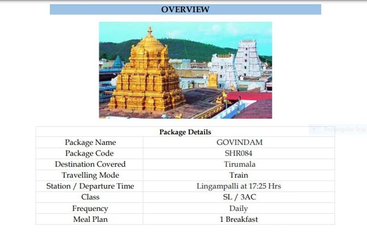 సికింద్రాబాద్ నుంచి ప్రారంభమయ్యే ఈ ప్యాకేజీ పేరు గోవిందం, రైలు ద్వారా ఈ టూర్ ప్యాకేజీ ప్రయాణం సాగుతుంది. ఐ ఆర్ సి టి సి కి చెందిన ఈ ప్యాకేజీలో తిరుమల శ్రీవారి దర్శనం, హోటల్ గది, ప్రయాణం మొత్తం కవర్ అవుతాయి. మీరు కుటుంబంతో సహా ఈ టూర్కు వెళ్లాలని ప్లాన్ చేస్తూ ఉంటే ఒక్కో వ్యక్తికి 3800 చార్జ్ చేస్తున్నారు. ఇందులో కేవలం ఒక రోజులోనే మీరు దర్శనము, ప్రయాణము, వసతి కల్పిస్తున్నారు.