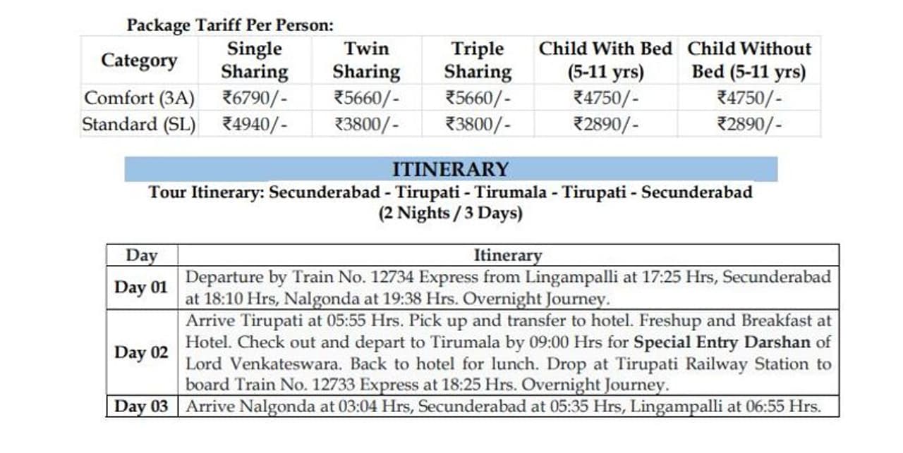 ఇక రాత్రంతా ప్రయాణించిన తర్వాత.. తెల్లవారుజామున 5.55 నిమిషాలకు తిరుపతికి చేరుకుంటారు. రైల్వే స్టేషన్ నుంచి హోటల్ గదికి తీసుకొని వెళ్తారు. అక్కడే ఫ్రెష్ అప్ అయిపోయి బ్రేక్ ఫాస్ట్ చేసిన తర్వాత తిరుమల కొండ మీదికి తీసుకుని వెళ్తారు. ఉదయం తొమ్మిది గంటలకు 300 రూపాయల స్పెషల్ ఎంట్రీ దర్శనం టికెట్ కింద మీరు దర్శనం చేసుకోవాల్సి ఉంటుంది దర్శనం అనంతరం. తిరుపతికి ప్రయాణం ఉంటుంది తిరుపతిలో భోజనం చేసుకున్న తర్వాత నేరుగా సాయంత్రం 6.25 నిమిషాలకు తిరుపతి రైల్వే స్టేషన్ లో రైలు ఎక్కిస్తారు.