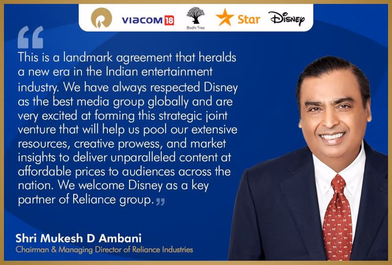 దీని వల్ల తమ వ్యాపారాభివృద్ధితో పాటు దేశంలోని ప్రేక్షకులకు చౌక ధరల్లో కంటెంట్ అందించడానికి వీలు పడుతుందని పేర్కొన్నారు. డిస్నీని రిలయన్స్ గ్రూప్లో భాగస్వామిగా చేయడానికి, ఆహ్వానిస్తున్నట్లుగా ముఖేష్ అంబానీ తెలిపారు. రిలయన్స్తో ఒప్పందం ద్వారా దేశంలోనే అతిపెద్ద మీడియా కంపెనీగా ఈ జాయింట్ వెంచర్ అవతరించనుందని, నాణ్యమైన ఎంటర్టైన్మెంట్, స్పోర్ట్స్ కంటెంట్ను అందించడం వీలుపడుతుందని వాల్ట్ డిస్నీ సీఈవో జాబ్ ఐగర్ పేర్కొన్నారు.