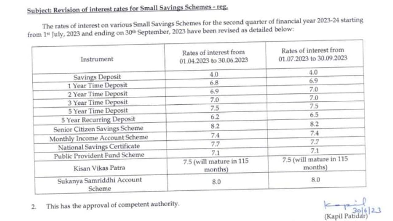 చిన్న పొదుపు పథకాల వడ్డీ రేట్లను కేంద్ర ప్రభుత్వం పెంచింది. జూలై 1 నుండి సెప్టెంబర్ 30, 2023 వరకు ప్రభుత్వం వడ్డీ రేట్లను పెంచుతున్నట్లు ప్రకటించింది.
