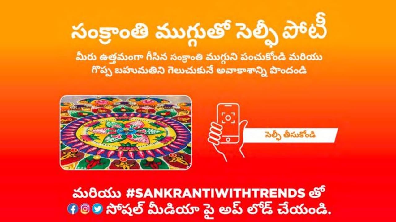 ఆంధ్రప్రదేశ్, తెలంగాణ రాష్ట్రాలలో ఉన్న ట్రెండ్స్ మకర సంక్రాంతి సందర్భంగా వినియోగదారులతో ఉన్న బంధాన్నిమరింత పెంచుకుంటోంది. ఇందుకు “ట్రెండ్స్ సెల్ఫీ విత్ రంగోలి” అనే ఒక ఆసక్తికరమైన పోటీ తీసుకొచ్చింది. ఏంటంటే వినియోగదారులు వారి ఇంటి ముందు లేదా ప్రాంగణంలో వేసిన రంగురంగు ముగ్గులతో ఓ సెల్ఫీ తీసుకోవాలి. దాన్ని ట్రెండ్స్ ఈ పోటీ కోసం ప్రత్యేకంగా పెట్టిన వాట్సాప్ నంబరుకు పంపాలి.