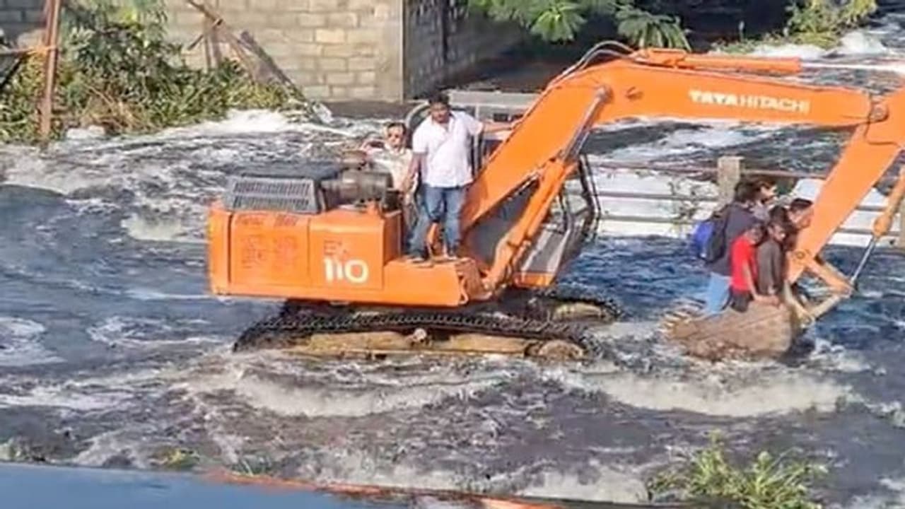 కొందరు ప్రయాణికులు ఆఫీస్ బట్టలు ధరించి, మరికొందరు బ్యాగ్లు పెట్టుకుని మెగా ఐటీ హబ్లోని ఏదో ఒక ఆఫీస్ వెళ్తున్నట్టు అవకాశం ఉందని సూచిస్తున్నారు. ఈ బుల్డోజర్ నెమ్మదిగా నీటి నుండి వెళుతున్నప్పుడు వారిలో ఒకరు వరదలను వీడియో తీస్తున్నారు.