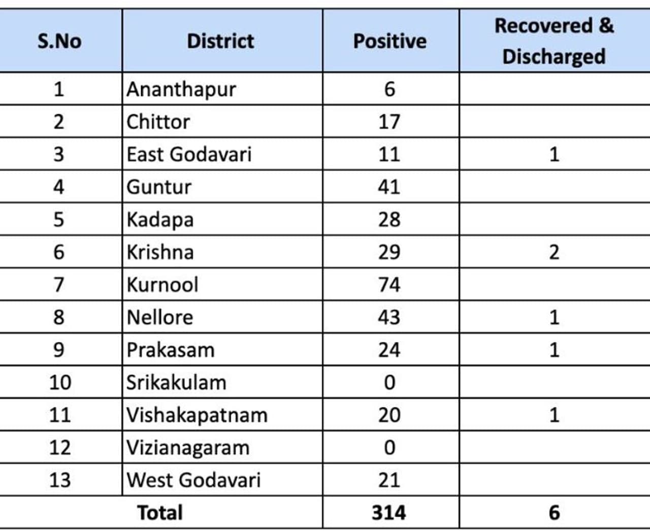 నిన్న ఉదయం 9 నుంచి సాయంత్రం వరకు జరిపిన పరీక్షల్లో 10 కొత్త కేసులు నమోదయ్యాయి. గుంటూరులో8, కడప, నెల్లూరుల్లో ఒక్కో కేసు చొప్పున నమోదయ్యింది. వీటితో కలుపుకొని మొత్తం కేసుల సంఖ్య 314 కి పెరిగింది.