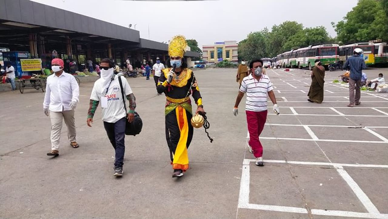 మాస్కులు పెట్టుకోని వారిని యమ ధర్మరాజు పట్టుకుపోయేందుకు సిద్ధంగా ఉన్నట్లు కార్యక్రమాన్ని చేపట్టారు టీఆర్ఎస్ నేత , తెలంగాణ బీసీ సంఘం రాష్ట్ర ప్రచార కార్యదర్శి జీఎస్ ఆనంద్. యమ ధర్మరాజు వేషంతో ఉన్న కళాకారుడిని వెంటబెట్టుకుని ప్రజలకు, మార్కెట్లో ఉన్న వారికి ఆయన వివరించారు.