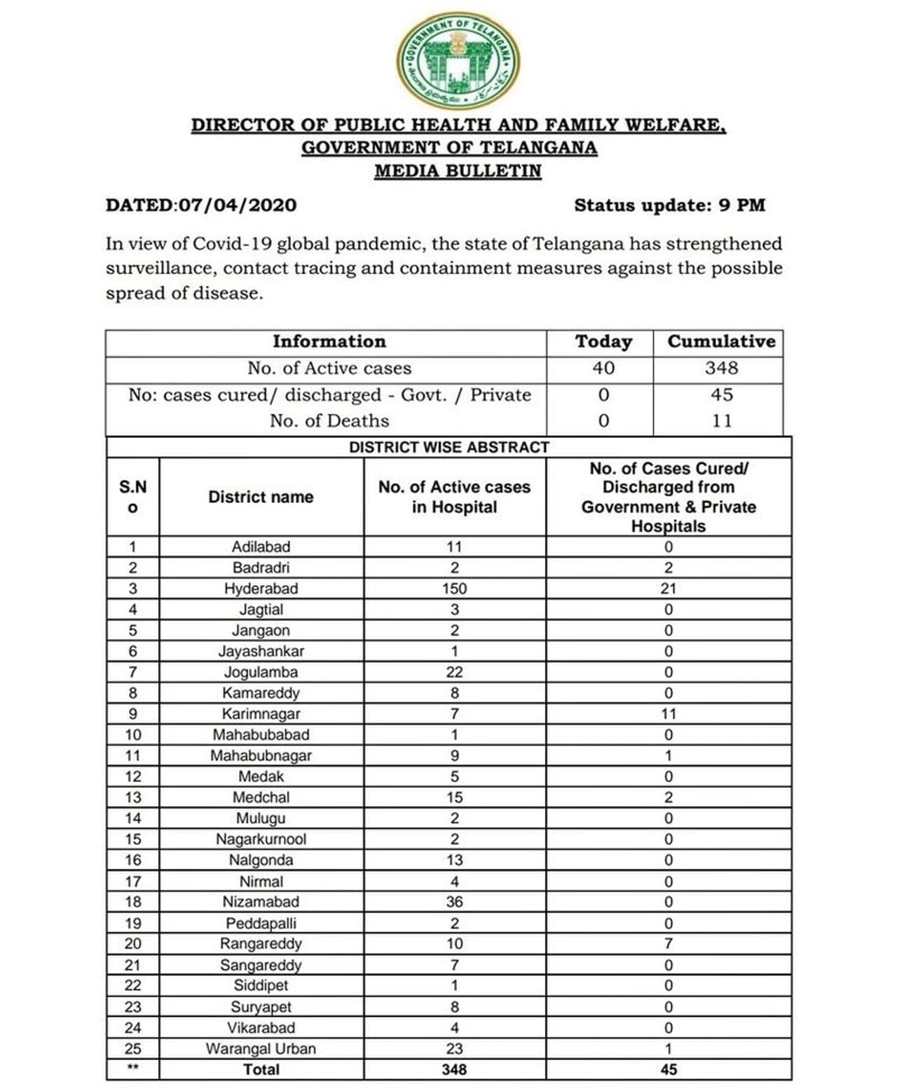 తెలంగాణలో కరోనా వైరస్ అంతకంతకు విస్తరిస్తుంది. మొన్న మొత్తం కేసుల సంఖ్యా 364 గా ఉండగా నిన్న ఆ సంఖ్యా 400 ను దాటింది. యాక్టీవ్ కేసుల సంఖ్య మాత్రం 348గా ఉంది. నిన్న ఒక్కరోజే 40 కేసులు నమోదయ్యాయి.