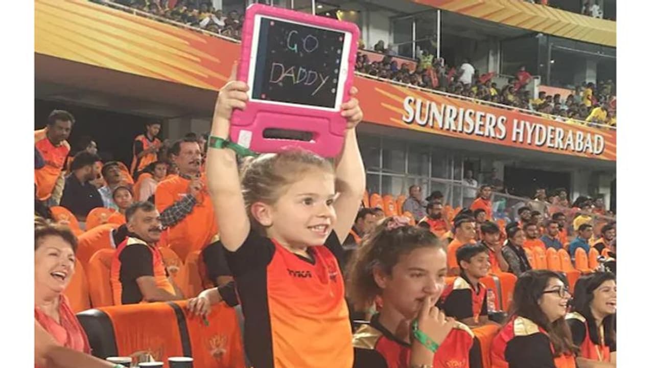 ఈ మ్యాచ్ లో టాస్ గెలిచిన చెన్నై మొదట బ్యాటింగ్ చేసిన విషయం తెలిసిందే. దీంతో సన్ రైజర్స్ జట్టు పీల్డింగ్ కోసం మైదానంలోకి ప్రవేశించిన సమయంలో వార్నర్ కూతురు తండ్రికి మద్దతుగా తన పలకపై స్వహస్తాలతో ''గో డ్యాడీ'' అని రాసి ప్రదర్శించింది. దీంతో మైదానంలోని కెమెరాలు ఆ పాపపైకి తిప్పడంతో బిగ్ స్క్రీన్ పై కనిపించింది. దీంతో తన కూతురు ప్లకార్డు చేతపట్టి తనకు మద్దతు తెలపడాన్ని చూసి వార్నర్ ఆనందంతో చిరునవ్వు నవ్వాడు.