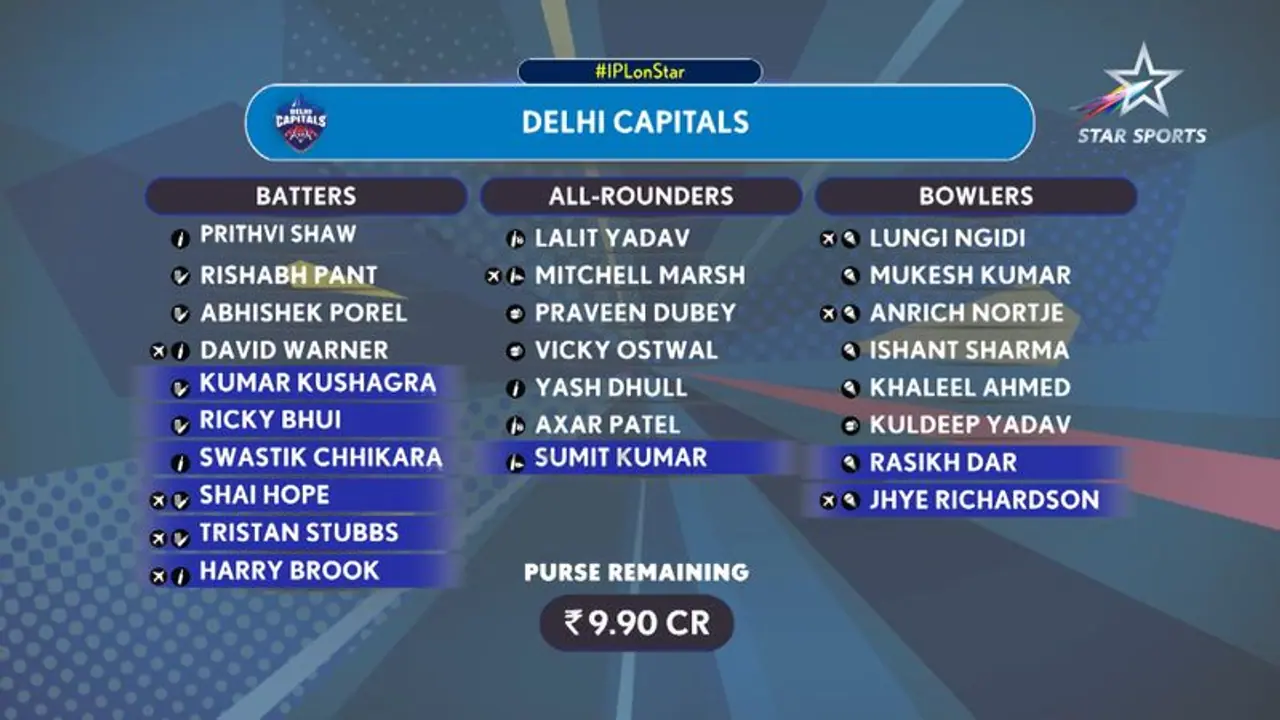 Delhi Capitals Squad: IPL 2024 వేలంలో ఢిల్లీ క్యాపిటల్స్ మొత్తం 9 మంది ఆటగాళ్లను కొనుగోలు చేసింది. వేలంలో ఢిల్లీ జట్టు భారత అన్క్యాప్డ్ ఆటగాడు కుమార్ కుషాగ్రాను రూ.7.20 కోట్లకు కొనుగోలు చేసింది. వేలం తరువాత పూర్తి జట్టు ఇలా ఉంది.