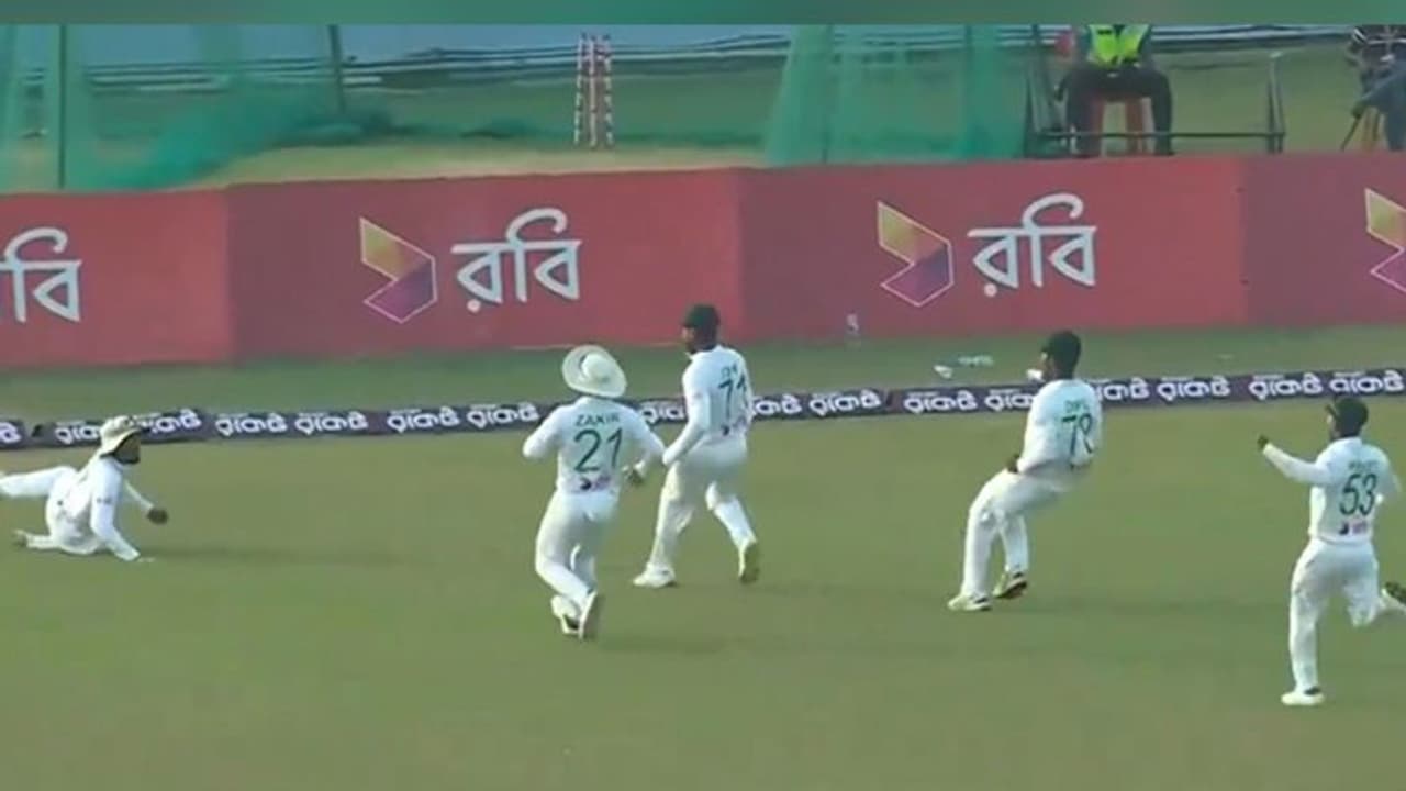 మ్యాచ్ రెండో రోజు కూడా ఇలాంటి ఒక తమాషా ఘటన కనిపించింది. రెండో రోజు 121వ ఓవర్ సమయంలో శ్రీలంక స్కోరు 419/6 కాగా, అదే సమయంలో బంగ్లాదేశ్ ఆటగాళ్లు సులువైన క్యాచ్ అందుకోలేకపోయారు. ఖలీద్ అహ్మద్ వేసిన బంతిని ప్రభాత్ జయసూర్య డ్రైవ్ చేయడానికి ప్రయత్నించాడు, కానీ బంతి బ్యాట్ అంచుని తీసుకొని స్లిప్లోకి వెళ్లింది. మొదటి స్లిప్ వద్ద నిలబడిన కెప్టెన్ నజ్ముల్ శాంటో ఈ క్యాచ్ను అందుకోలేకపోయాడు, ఆ తర్వాత బంతి అతని చేతికి తాకడంతో రెండవ స్లిప్లో షహదత్ హుస్సేన్కి వెళ్లి, అతను కూడా క్యాచ్ను అందుకోలేకపోయాడు. థర్డ్ స్లిప్లో నిలబడిన జకీర్ హసన్ బంతి దగ్గరకు వచ్చినా అందుకోలేకపోయాడు. ఈ వీడియో కూడా సోషల్ మీడియాలో వైరల్గా మారింది.