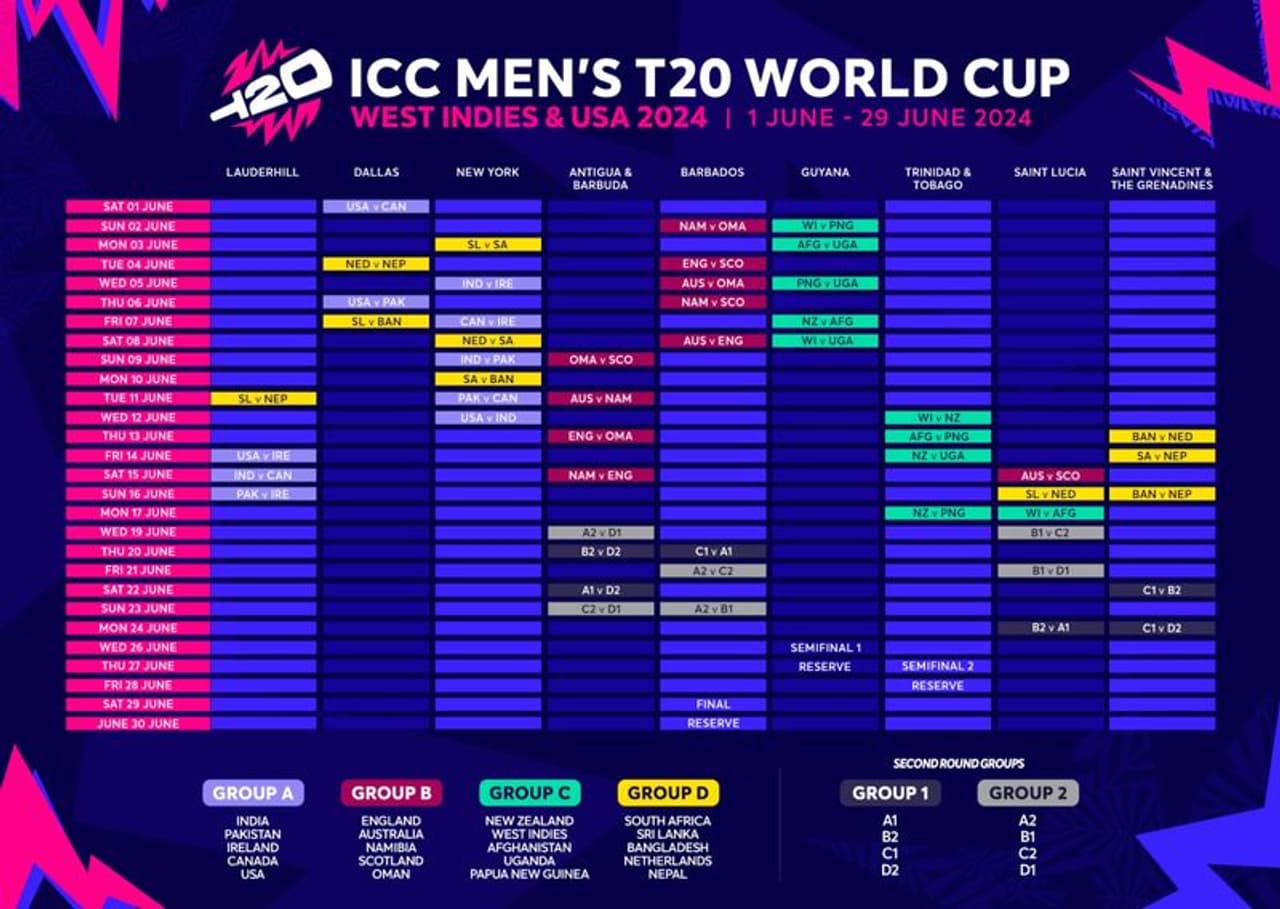 టీ20 వరల్డ్ కప్ 2024 షెడ్యూల్ విడుదలైంది. జూన్ 1వ తేదీ నుంచి ఈ మ్యాచ్లు ప్రారంభం కానున్నాయి. జూన్ 9వ తేదీన ఇండియా వర్సెస్ పాకిస్తాన్ మ్యాచ్ న్యూయార్క్లో జరగనుంది.