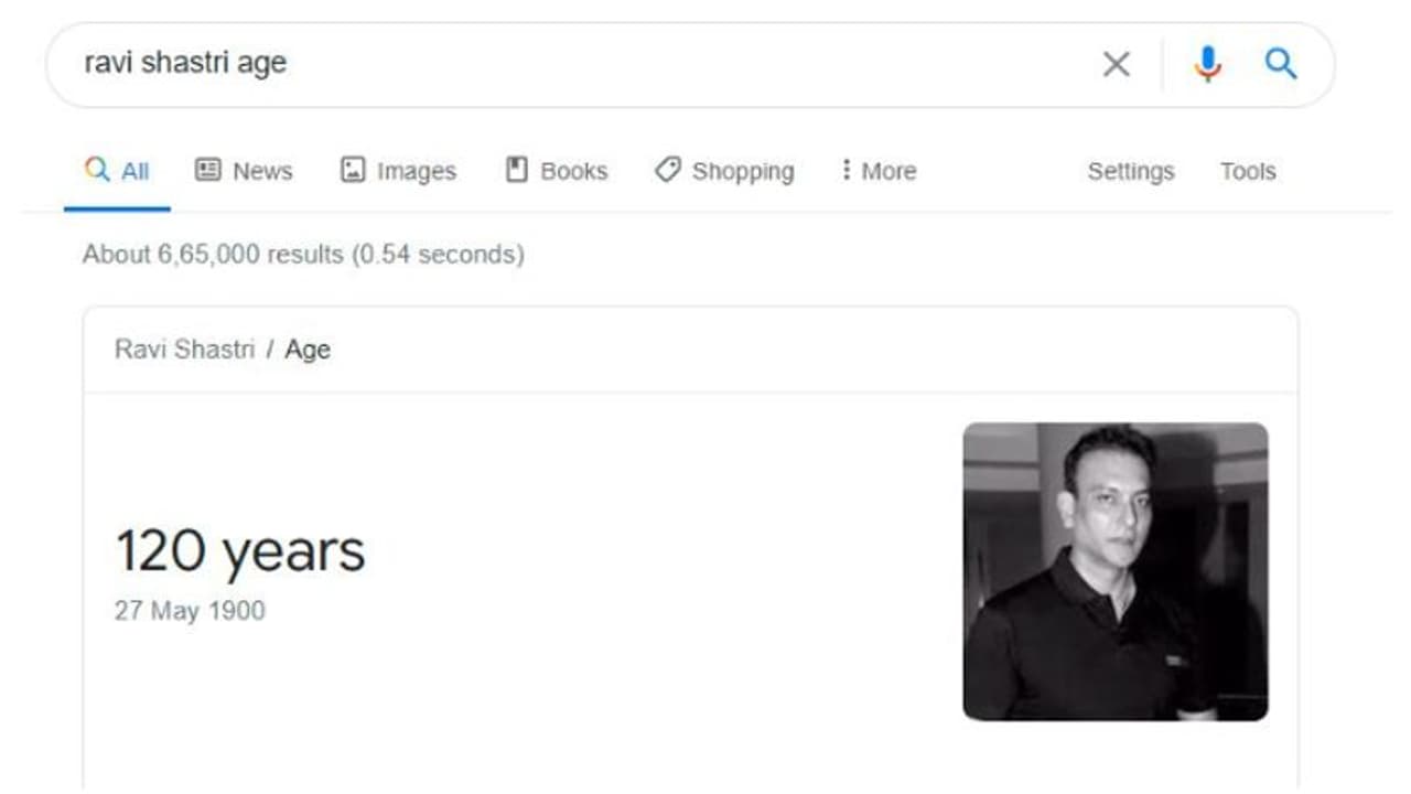 భారత హెడ్ కోచ్ రవిశాస్త్రికి ట్రోలింగ్ కొత్తేమీ కాదు. భారత జట్టు ఘోరమైన ప్రదర్శన చూపించినప్పుడల్లా ఆ ఎఫెక్ట్ కోచ్ రవిశాస్త్రిపైనే ఎక్కువగా పడుతుంది. భారత జట్టు విజయాల్లో మాత్రం కోచ్ రవిశాస్త్రికి క్రెడిట్ దక్కే సందర్భాలు చాలా తక్కువ. ఇదిలా ఉంచితే తాజాగా అప్పుడప్పుడూ సిల్లీ తప్పులు చేసే గూగుల్ తల్లి, మాజీ క్రికెటర్, భారత జట్టు హెడ్ కోచ్ రవిశాస్త్రి వయసు 120 ఏళ్లు అంటూ చూపిస్తోంది.