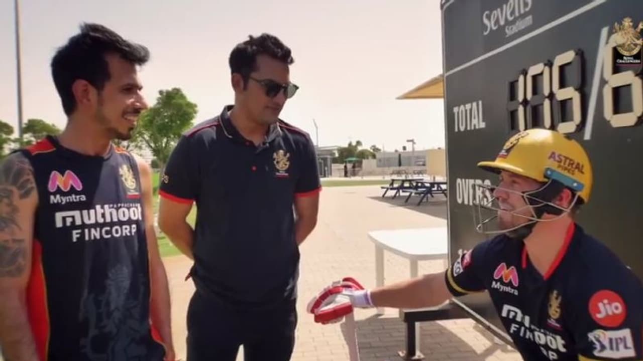 ప్రాక్టీస్ సెషన్లో తానే కెప్టెన్నంటూ అందరితో ఆడుకున్న చాహాల్, ఏబీ డివిల్లియర్స్కు బ్యాటింగ్ పాఠాలు కూడా నేర్పాడు. మిగిలినవారికి అర్థం కాకుండా ఆర్సీబీ జట్టు సభ్యులందరూ ఓ కోడ్ భాషలో సంభాషించుకుంటున్నారు.