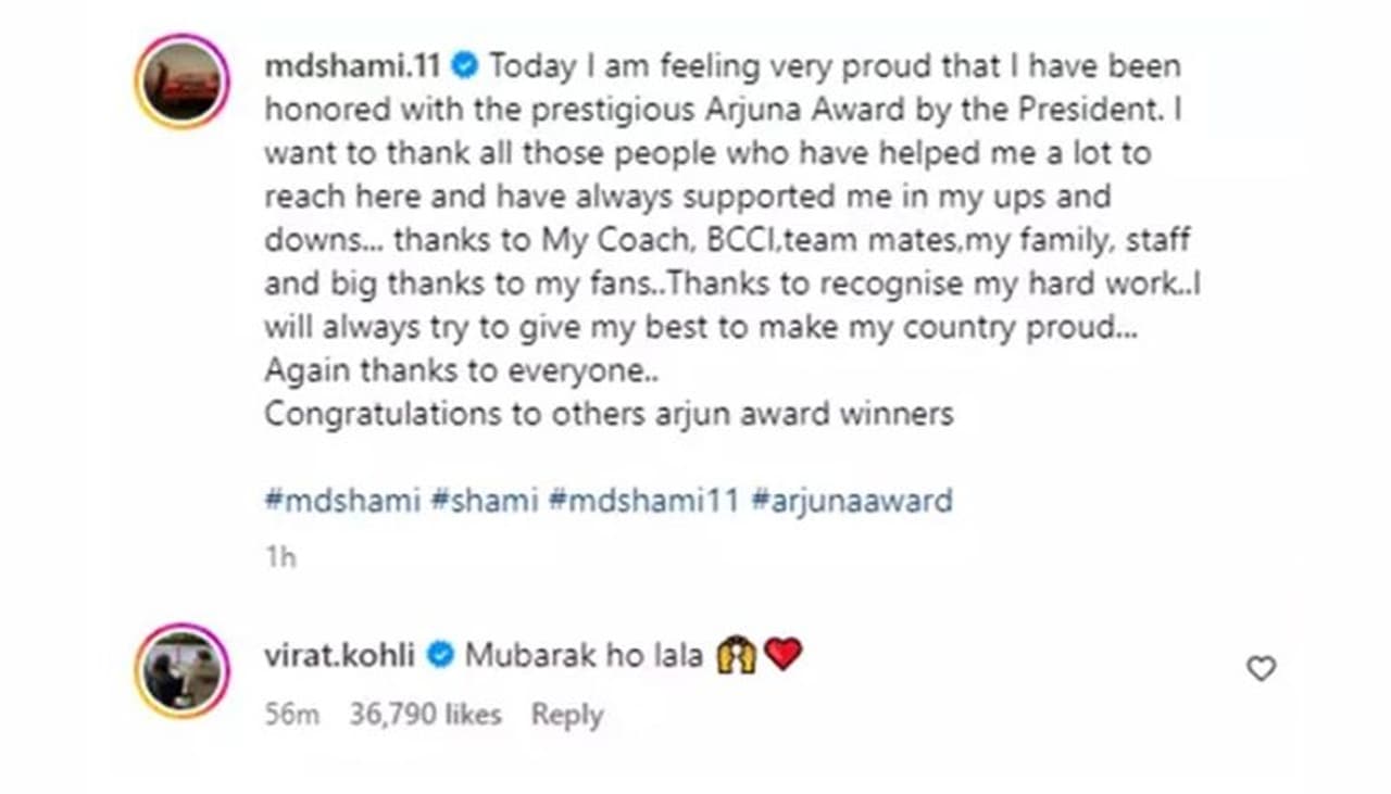 Mohammed Shami : టీమిండియా పేసర్ మహ్మద్ షమీ క్రికెట్ లో తన అద్భుతమైన ఆటతో రాణించినందుకు భారత ప్రభుత్వం అర్జున అవార్డుతో సత్కరించింది. ఈ క్రమంలోనే రాష్ట్రపతి చేతుల మీదుగా అర్జున అవార్డు అందుకున్న షమీకి భారత స్టార్ బ్యాట్స్మెన్ విరాట్ కోహ్లి తన అభినందనలు తెలిపాడు.