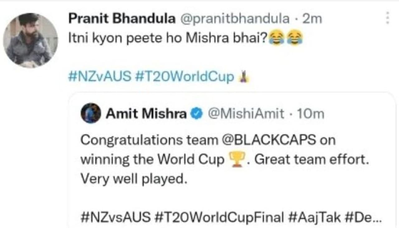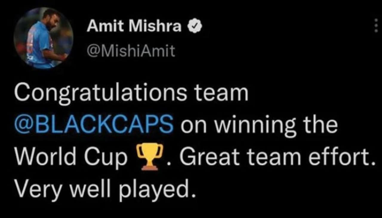 ఇంతకీ Amit Mishra చేసిన తప్పిదమేమిటంటే.. నిన్న రాత్రి మ్యాచ్ ముగిసిన అనంతరం ట్విట్టర్ వేదికగా అతడు స్పందించాడు. ఆసీస్ కు శుభాకాంక్షలు చెప్పాల్సింది పోయి న్యూజిలాండ్ కు విషెస్ చెప్పాడు. ‘ప్రపంచకప్ గెలిచినందుకు బ్లాక్ క్యాప్స్ (న్యూజిలాండ్) కు శుభాకాంక్షలు. సమిష్టి విజయం. చాలా బాగా ఆడారు’ అని ట్వీట్ చేశాడు. ఇంకేం.. బాధితులు ఎక్కడ దొరుకుతారా..? అని 24 గంటల పాటు ఆన్ లైన్ లో వేచి చూసే నెటిజనులకు అమిత్ మిశ్రా.. ఆ అర్ధరాత్రి మంచి విందు భోజనం పెట్టాడు.