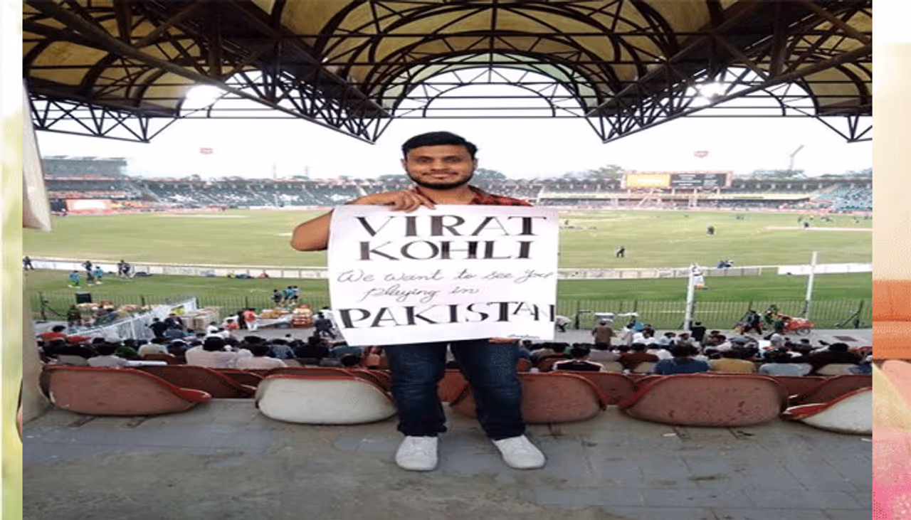 ఇంతకీ మ్యాటరేంటంటే.. పాకిస్తాన్-శ్రీలంక జట్ల మధ్య బుధవారం మూడో టీ 20 మ్యాచ్ లాహోర్ లో జరిగింది. ఈ సందర్భంగా షాబాజ్ షరీఫ్ అనే ఓ అభిమాని.. కోహ్లీకోసం ఓ సందేశం పంపాడు. ఓ ప్లకార్డు పట్టుకొని దాని మీద కోహ్లీ మీరు పాకిస్తాన్ లో క్రికెట్ ఆడితే చూడాలని ఉందని అని రాసి పట్టుకొని స్టేడియంలో తిరుగుతూ కనిపించాడు.