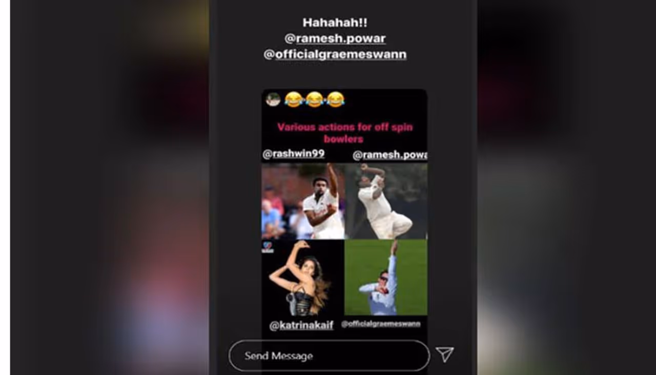 నిజానికి ఈ కొల్లేజ్ను ఓ అభిమాని క్రియేట్ చేశాడు. ఇందులో ఆఫ్ స్పిన్నర్లు అశ్విన్, రమేశ్ పొవార్, ఇంగ్లండ్ మాజీ బౌలర్ గ్రేమ్ స్వాన్ ఉన్నారు. అయితే, విచిత్రంగా వారితోపాటే బౌలింగ్ యాక్షన్ను తలపించేలా ఉన్న కత్రినా కైఫ్ డ్యాన్స్ క్లిప్ను కూడా జోడించాడు. అది అచ్చం బౌలింగ్ యాక్షన్ను తలపిస్తోంది. అశ్విన్ ఈ మీమ్ను తన ఇన్స్టాగ్రామ్ స్టోరీలో పోస్టు చేసి టీమిండియా మాజీ స్పిన్నర్ రమేశ్ పొవార్, ఇంగ్లండ్ మాజీ బౌలర్ గ్రేమ్ స్వాన్లను ట్యాగ్ చేశాడు.