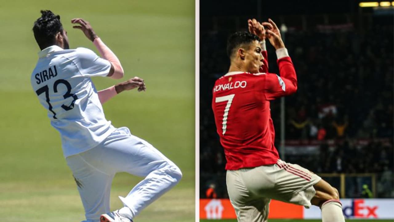 దక్షిణాఫ్రికా ఇన్నింగ్స్ లో ఆ జట్టు నాలుగో స్థానంలో బ్యాటింగ్ కు వచ్చిన డసెన్ ను సిరాజ్ ఔట్ చేశాడు. ఇన్నింగ్స్ 12.5 ఓవర్లో సిరాజ్ బౌలింగ్ లో అతడు.. అజింక్యా రహానే కు క్యాచ్ ఇచ్చి వెనుదిరిగాడు. దీంతో సిరాజ్.. రొనాల్డో మాదిరిగా సంబురాలు జరుపుకున్నాడు. గోల్ కొట్టిన తర్వాత రొనాల్డో.. పిడికిలి బిగించి కుడి చేతిని భూమివైపునకు బలంగా లాగుతాడు.
