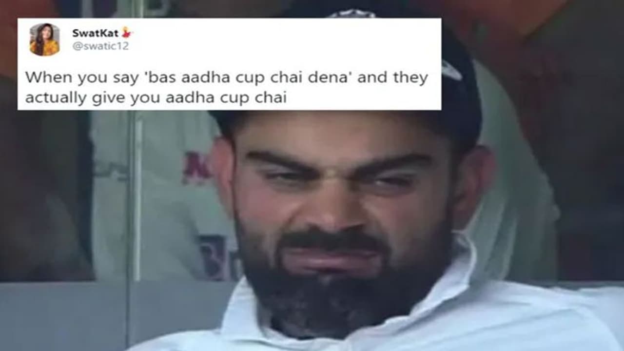 కోహ్లి ఎక్స్ప్రెషన్ చూస్తే.. దానిని అసహ్యించుకుంటున్నట్లు తెలుస్తుంది. ఈ ఫోటోను సోషల్ మీడియాలో షేర్ చేయగా.. నెటిజన్లు తమదైన మీమ్స్, ట్రోల్స్తో చెలరేగిపోయారు. 'కోహ్లికి చాయ్ ఇష్టం లేనట్లు ఉంది.. అందుకే ముఖాన్ని వికారంగా పెట్టాడు.. జీవితంలో చేసిన తప్పుల గురించి ఆలోచిస్తూ ఎక్కడ తప్పు చేశానో.. రక్షాబంధన్ రోజు అబ్బాయిలను స్కూల్కు పంపితే ఎలా ఉంటుందో అలా ఉంది కోహ్లి పరిస్థితి' అంటూ రకరకాల మీమ్స్ పెట్టేశారు. దీంతో కోహ్లి ఫోటో ట్రెండింగ్ లిస్ట్లో చేరిపోయింది.