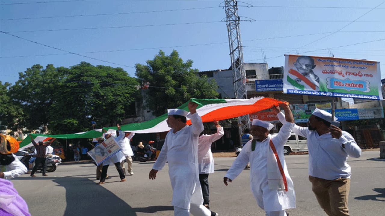 150వ జయంతి కనుక 150మీటర్ల పొడవుగల జాతీయ పతకాన్ని తయారు చేసి... ఊరేగించారు. రాజు చౌక్ నుంచి గాంధీ విగ్రహం వరకు ర్యాలీ నిర్వహించారు. గాంధీ ప్లకార్డులను ప్రదర్శించారు. గాంధీ సూక్తులను ప్రదర్శించారు. అనంతరం గాందీ విగ్రహానికి పూలమాలలు వేసి నివాళులర్పించారు. ఈ కార్యక్రమంలో జిల్లాకు చెందిన పలువురు సీనియర్ నేతలు, పార్టీ కార్యకర్తలు పాల్గొన్నారు. 150మీటర్ల జాతీయ పతాకాన్ని ప్రదర్శించడం అందరినీ ఆకట్టుకుంది.