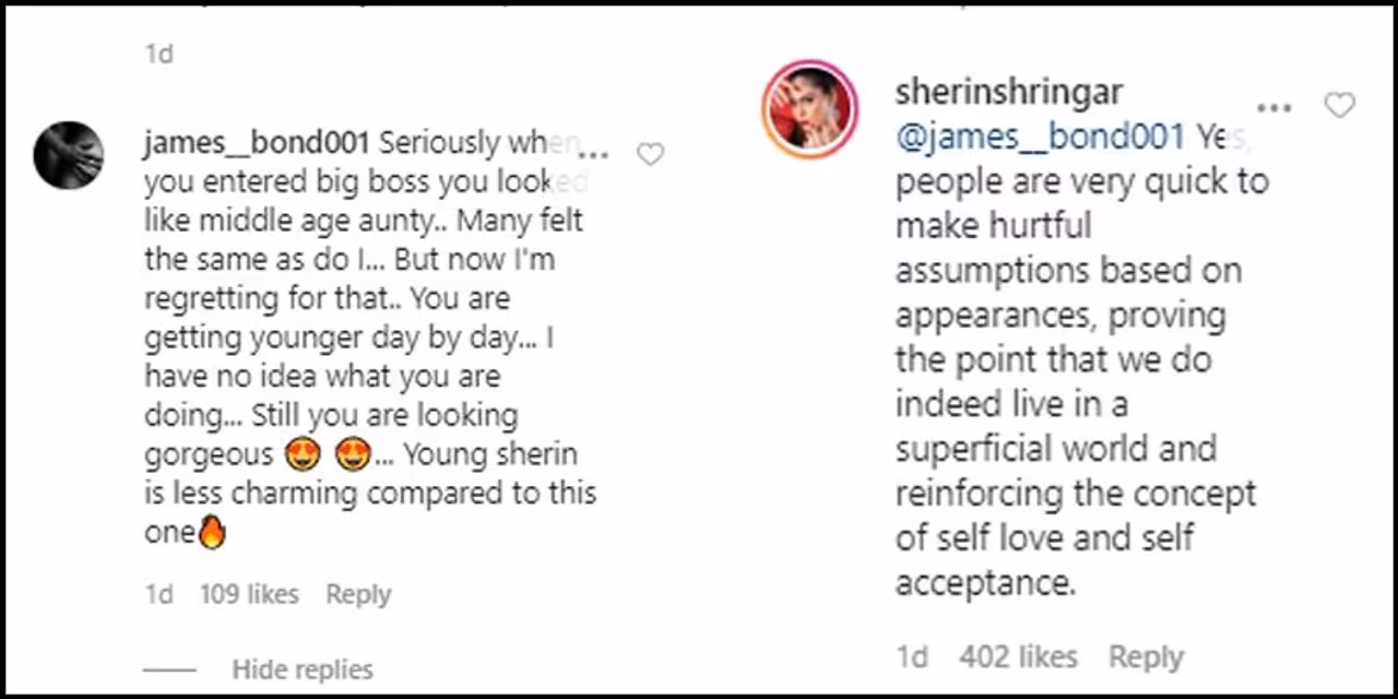 షెరీన్ అతడికి రిప్లై ఇచ్చింది. 'అవును, కొంతంది రూపాన్ని చూసి భాదని కలిగించేలా కెమెంట్స్ చేస్తుంటారు. కానీ తెలుసుకోవలసింది ఏమిటంటే మనం భూమిపై జీవించే ఆత్మాభిమానం, మనల్ని మనం అభిమానించుకునే మనుషులం అని' అంటూ షెరీన్ రిప్లై ఇచ్చింది.
