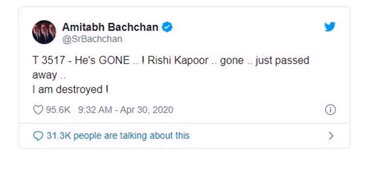 అతడు కొద్దిసేపటి క్రితమే వెళ్ళిపోయాడు.. నేను కుప్పకూలిపోయాను అని అమితాబ్ బచ్చన్ ట్వీట్ చేశారు.
