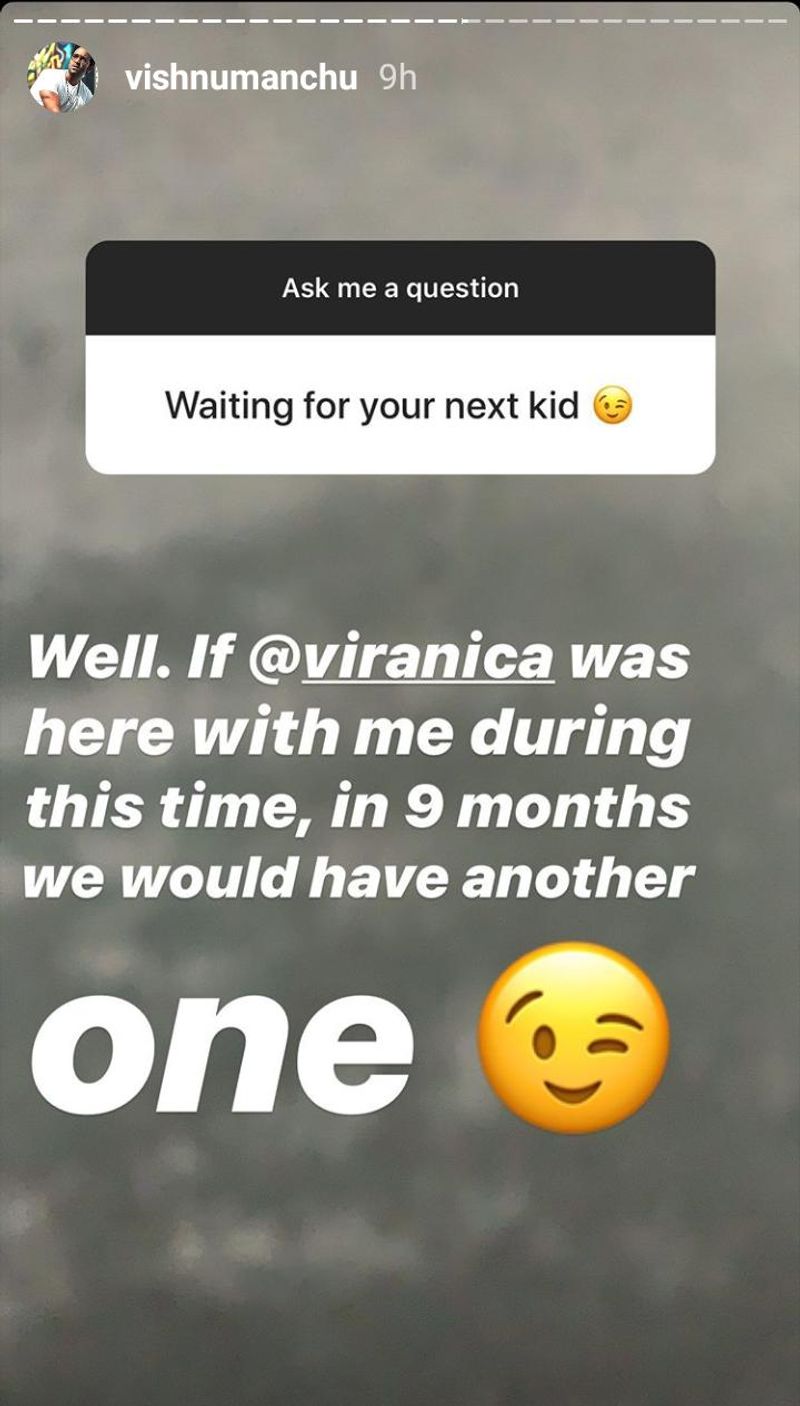లాక్ డౌన్లో భాగంగా ఖాళీగా ఉంటుంన్న మంచు విష్ణు బుధవారం సోషల్ మీడియా ద్వారా అభిమానులతో ముచ్చటించాడు. ఈ సందర్భంగా ఓ అభిమాని `మీ తదుపరి పాప కోసం ఎదురు చూస్తున్నాం` అంటూ కామెంట్ చేశాడు. ఈ కామెంట్ కు రిప్లైగా.. `ఈ సమయంలో విరానికా ఇక్కడే నాతో ఉండి ఉంటే మరో 9 నెలల్లో మరో చిన్నారి వచ్చేది` అంటూ కామెంట్ చేశాడు. దీంతో ఒక్కసారిగా అంతా అవాక్కయ్యారు. ఈ కామెంట్పై విరానికా కూడా స్పందించింది. `యా రైట్` అంటూ కామెంట్ చేసింది విరానికా.