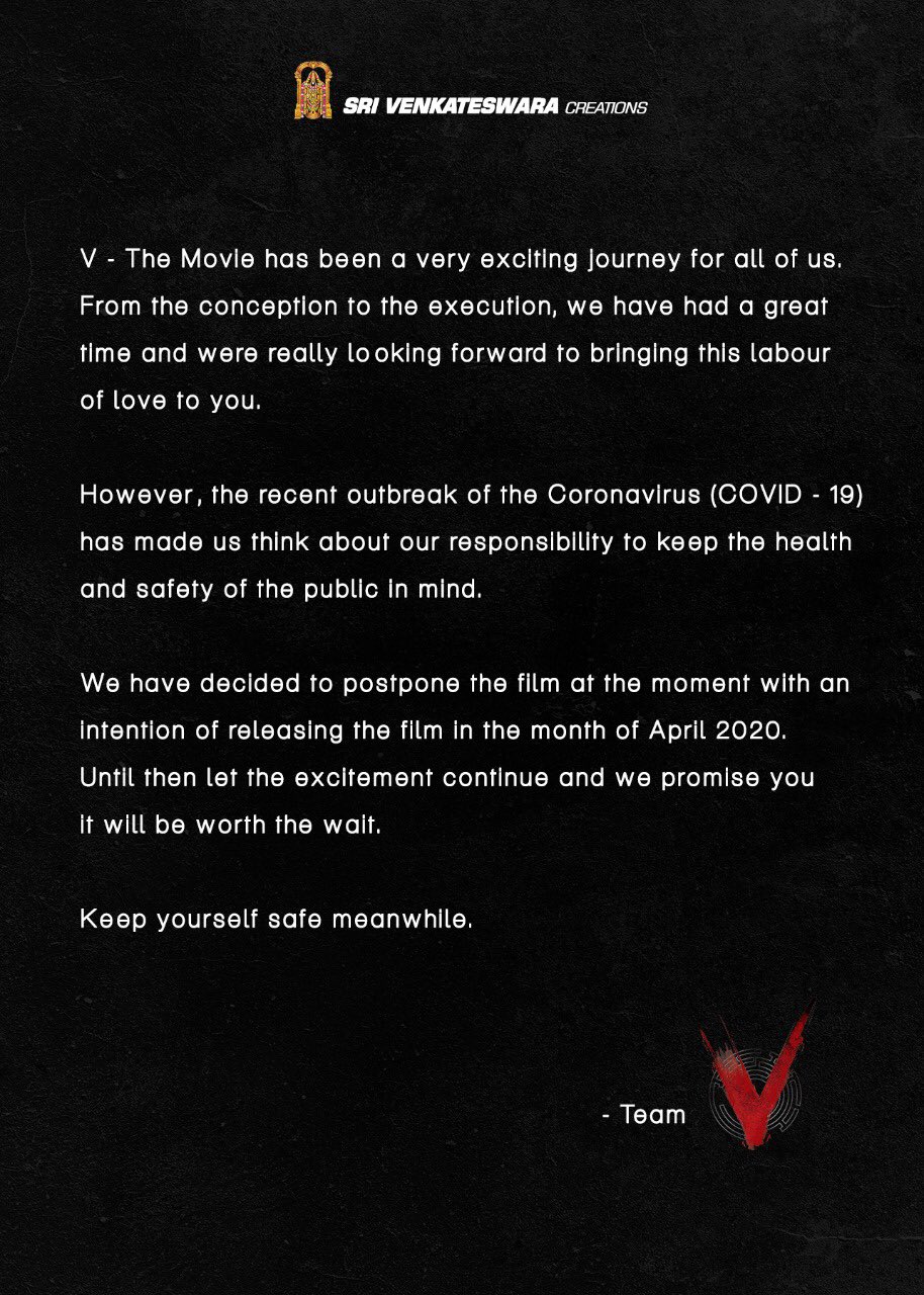కానీ కరోనా వైరస్ కారణంగా నాని కూడా వెనకడుగు వేయకతప్పలేదు. వరల్డ్ వైడ్ గా జనాలను ఇబ్బంది పెడుతున్న కరోనా సినిమాల రిలీజ్ పై కూడా తీవ్రంగా ప్రభావం చూపుతోంది. హాలీవుడ్ సినిమాలు సైతం రిస్క్ చేయకూడదని ఏడాదిపాటు రిలీజ్ డేట్ ని వాయిదా వేసుకుంటున్నాయి. ఇక ఇప్పుడు నాని 'V' సినిమా కూడా వాయిదా పడింది. ఏప్రిల్ లో సినిమాను రిలీజ్ చేసేది ఆలోచనలో ఉన్నట్లు తెలుస్తోంది.