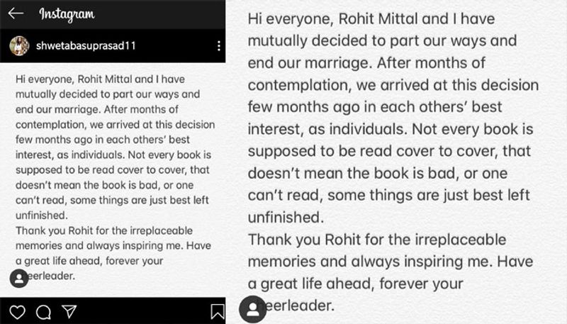 పెళ్లైన ఏడాదికే తన భర్తతో విడిపోతున్నట్లు శ్వేతాబసు సోషల్ మీడియా వేదికగా వెల్లడించింది. తమ వివాహ బంధానికి ఫుల్ స్టాప్ పెడుతూ.. భర్త రోహిత్ మిట్టల్, తను పరస్పర అంగీకారనంతో విడిపోతున్నట్లు ప్రకటించింది. ఇకపై ఎవరి దారులు వారివి అంటూ సోషల్ మిదలో రాసుకొచ్చింది.