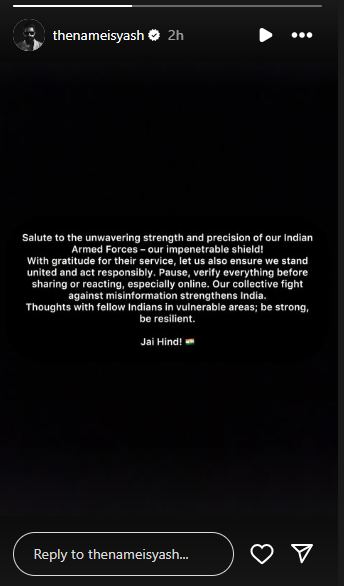 ఇండియా, పాకిస్తాన్ మధ్య ఉద్రిక్త వాతావరణం నెలకొంది. సెలబ్రిటీలు భారత సైన్యానికి మద్దతు తెలియజేస్తున్నారు. నటుడు యష్ కూడా ఓ పోస్ట్లో తన అభిప్రాయాన్ని వ్యక్తం చేశారు.