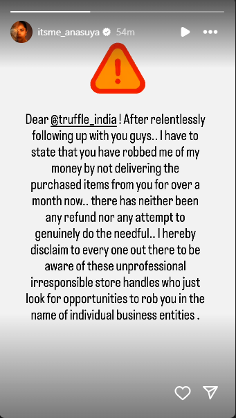 అవకాశం చూసి తనని ఆ సంస్థ మోసం చేసినట్లు అనసూయ గ్రహించింది. ఇంతవరకు డబ్బులు రిఫండ్ కూడా చేయలేదు. కేవలం మోసం చేయడానికి మాత్రమే ఆన్లైన్ లో ఎదురు చూసే వారి పట్ల జాగ్రత్తగా ఉండండి అని అనసూయ తన ఇంస్టాగ్రామ్ లో పోస్ట్ పెట్టింది. బాధ్యత లేని ఇలాంటి ఆన్లైన్ స్టోర్ ల పట్ల జాగ్రత్తగా ఉండండి అంటూ అనసూయ నెటిజన్లను హెచ్చరించింది.