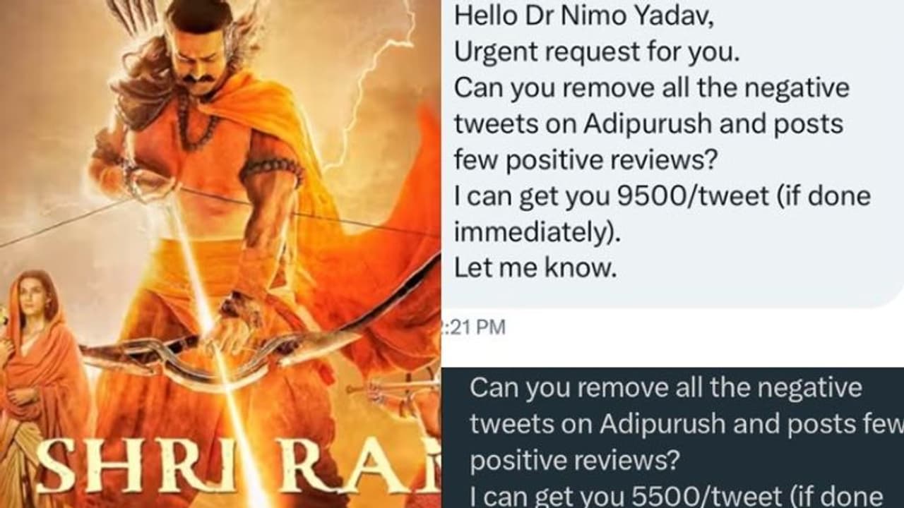 'హలో డాక్టర్ నిమో యాదవ్, మీకు ఓకేఅర్జెంటు రిక్వస్ట్.. ఆదిపురుష్ పై నెగిటివ్ ట్వీట్స్ డిలీట్ చేసి పాజిటివ్ పోస్ట్ లు పెట్టండి. ఒక్కో పోస్ట్ కి రూ 9500 ఇస్తాం. వెంటనే ఆ పని చేసి మాకు తెలియజేయండి డబ్బు వస్తుంది' అనే మెసేజ్ ని అతడు తన ట్విట్టర్ లో పోస్ట్ చేశాడు.
