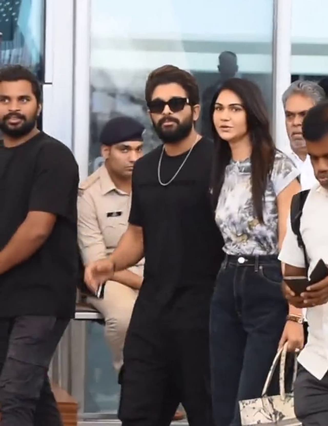 వీరిద్దరూ ఎయిర్ పోర్ట్ లో వస్తున్న దృశ్యాలు సోషల్ మీడియాలో వైరల్ అవుతున్నాయి. అల్లు అర్జున్, స్నేహ ఇద్దరూ సూపర్ స్టైలిష్ లుక్ లో మెరిసిపోతున్నారు. అల్లు అర్జున్ తన ట్రేడ్ మార్క్ హెయిర్ స్టైల్, బియర్డ్ తో కనిపిస్తుండగా.. అల్లు స్నేహ జీన్స్ ధరించి కనిపిస్తోంది.