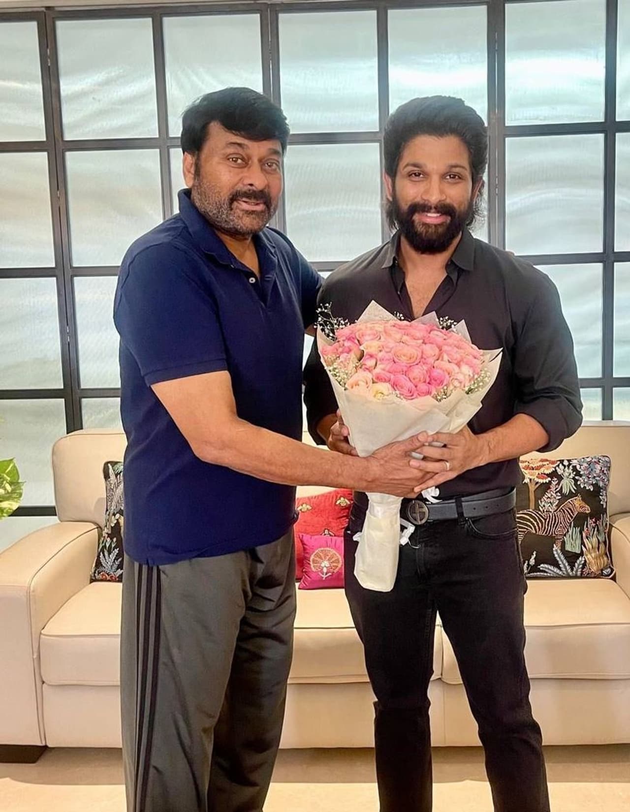చిత్ర పరిశ్రమ నుంచి ప్రముఖులు అల్లు అర్జున్ కి వరుసగా శుభాకాంక్షలు తెలుపుతున్నారు. ఇప్పుడు ఏకంగా మెగాస్టార్ అంతటి వ్యక్తి నుంచి బన్నీకి అదిరిపోయే విధంగా అభినందనలు దక్కాయి. నేషనల్ అవార్డు ప్రకటించిన తర్వాత తొలిసారి బన్నీ చిరంజీవిని కలిశారు.